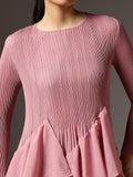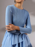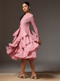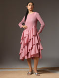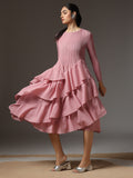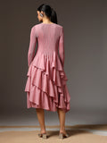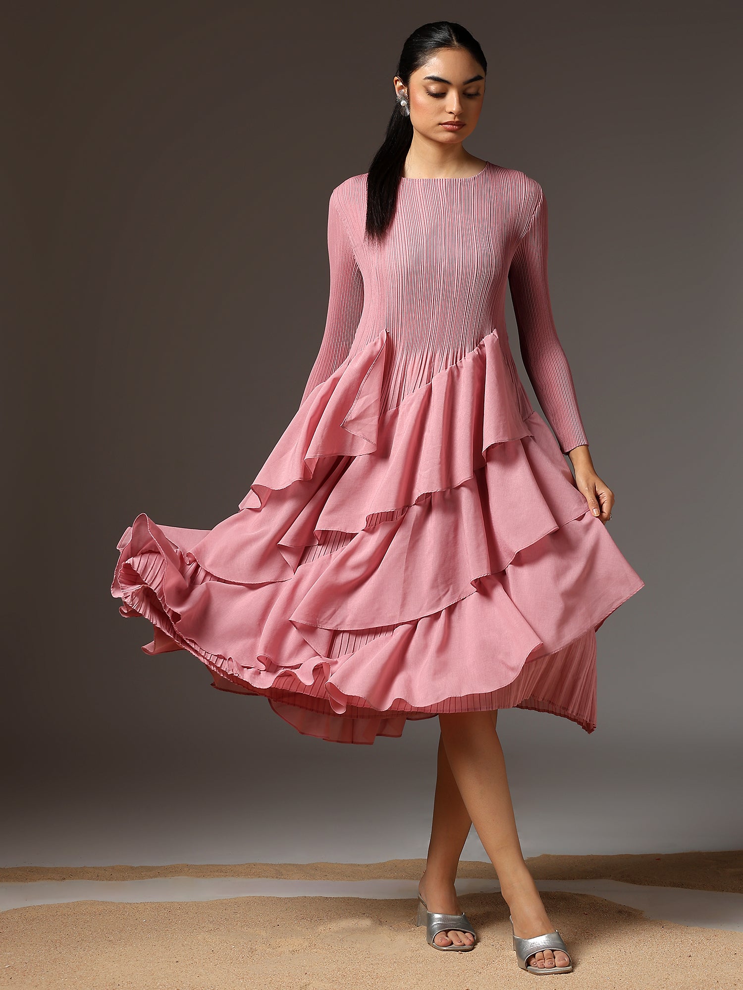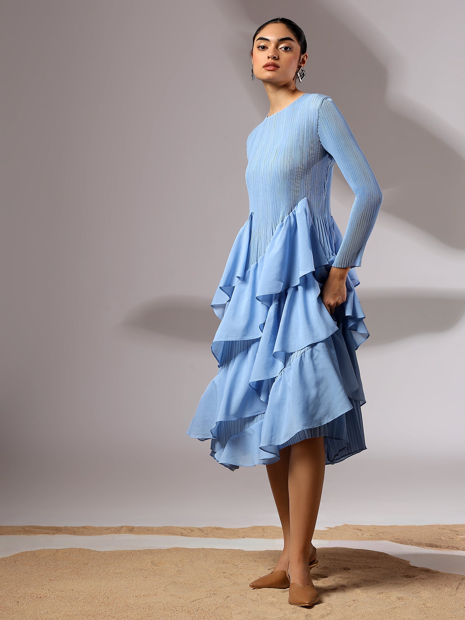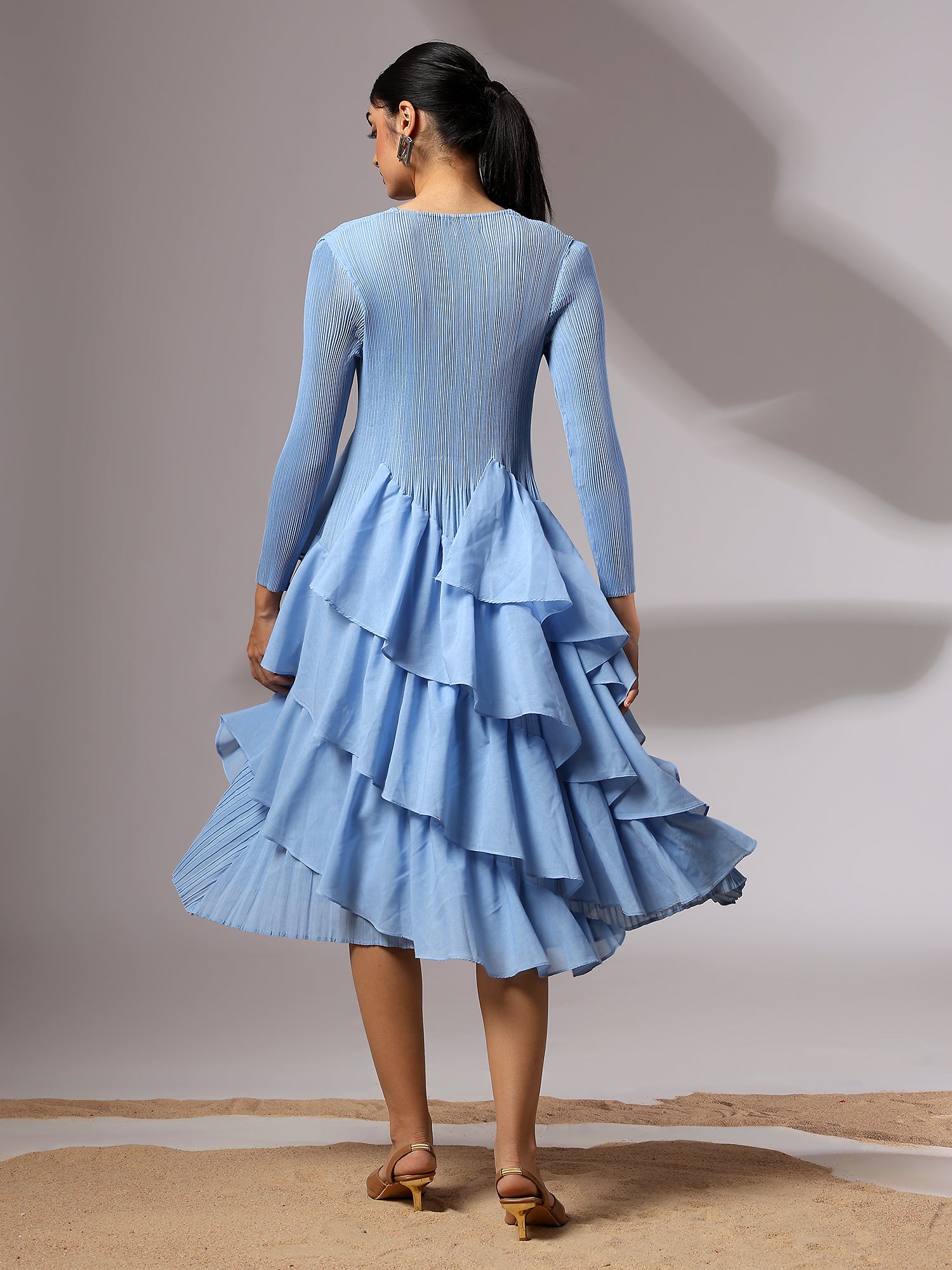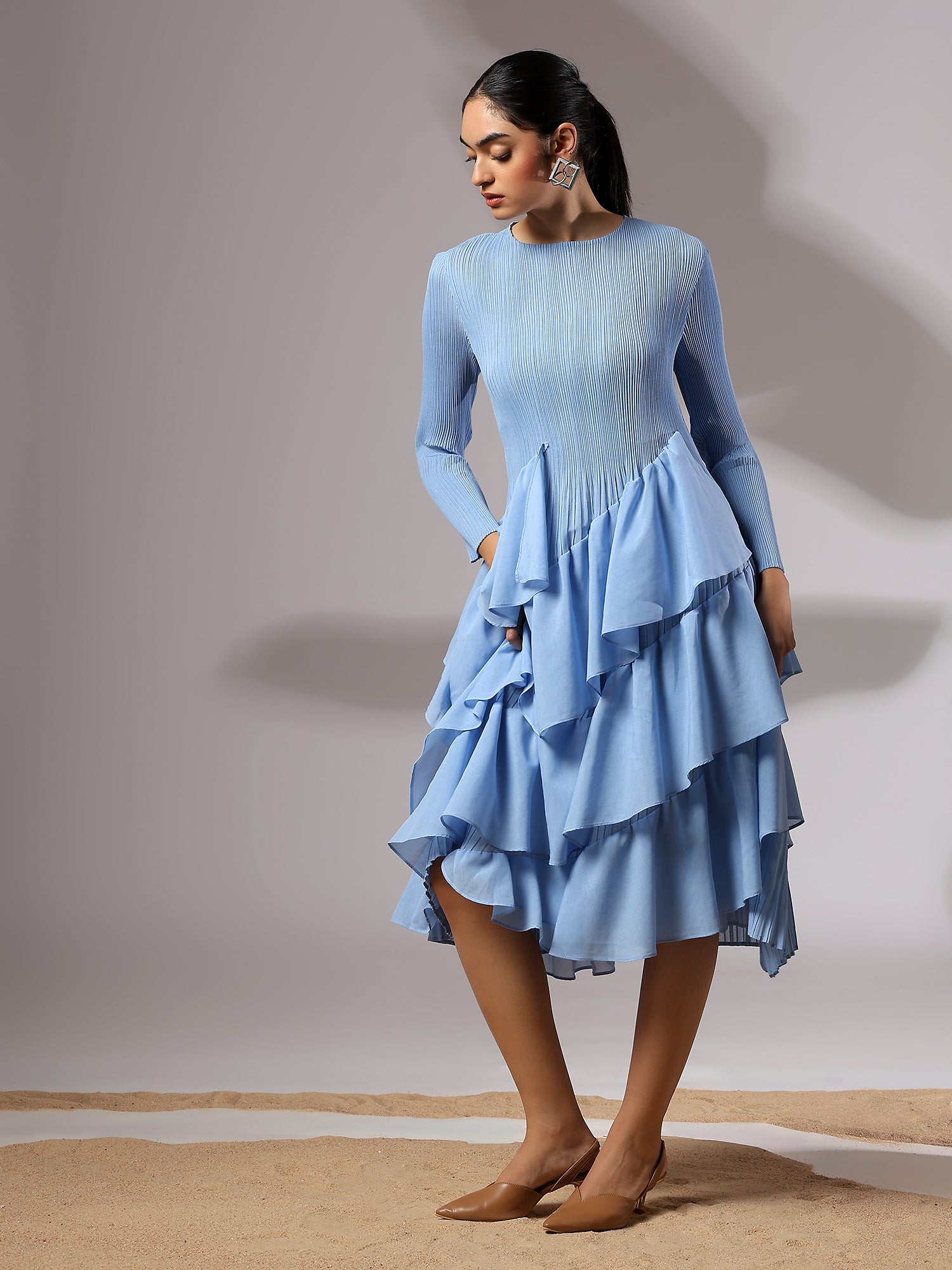 Add a touch of drama to your wardrobe with the "Ruffle Rush Pleated Cascade Dress". This eye-catching design features a finely pleated, full-sleeve bodice that hugs the upper body, paired with a bold, layered ruffle skirt that sways with every step. Available in two dreamy shades — powder blue and dusty rose — this dress blends elegance with a touch of whimsy, making it your perfect pick for brunches, soirées, or artistic evenings out.