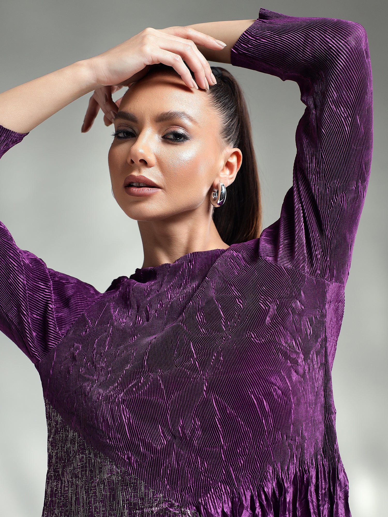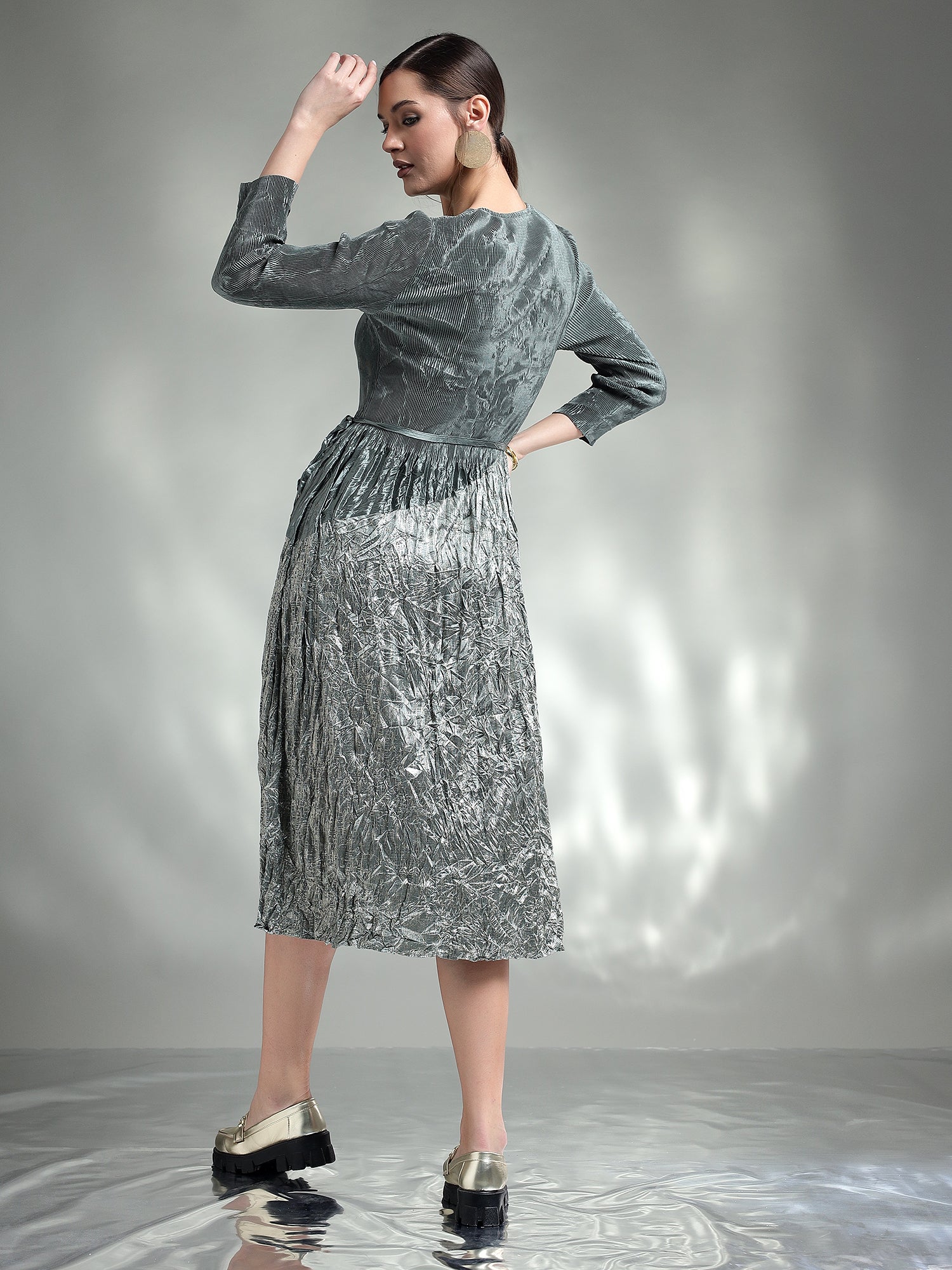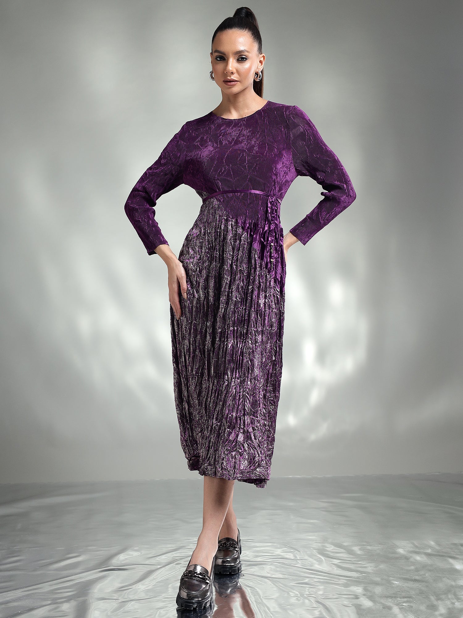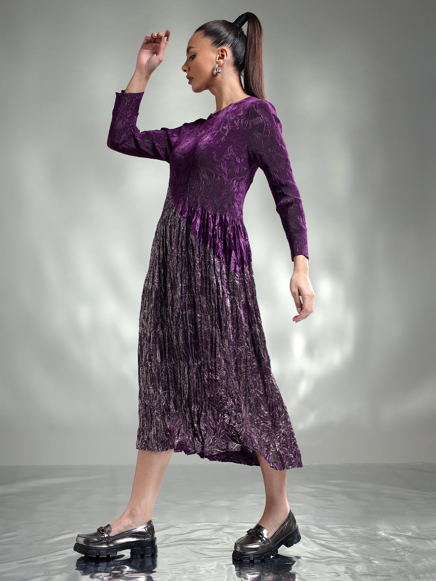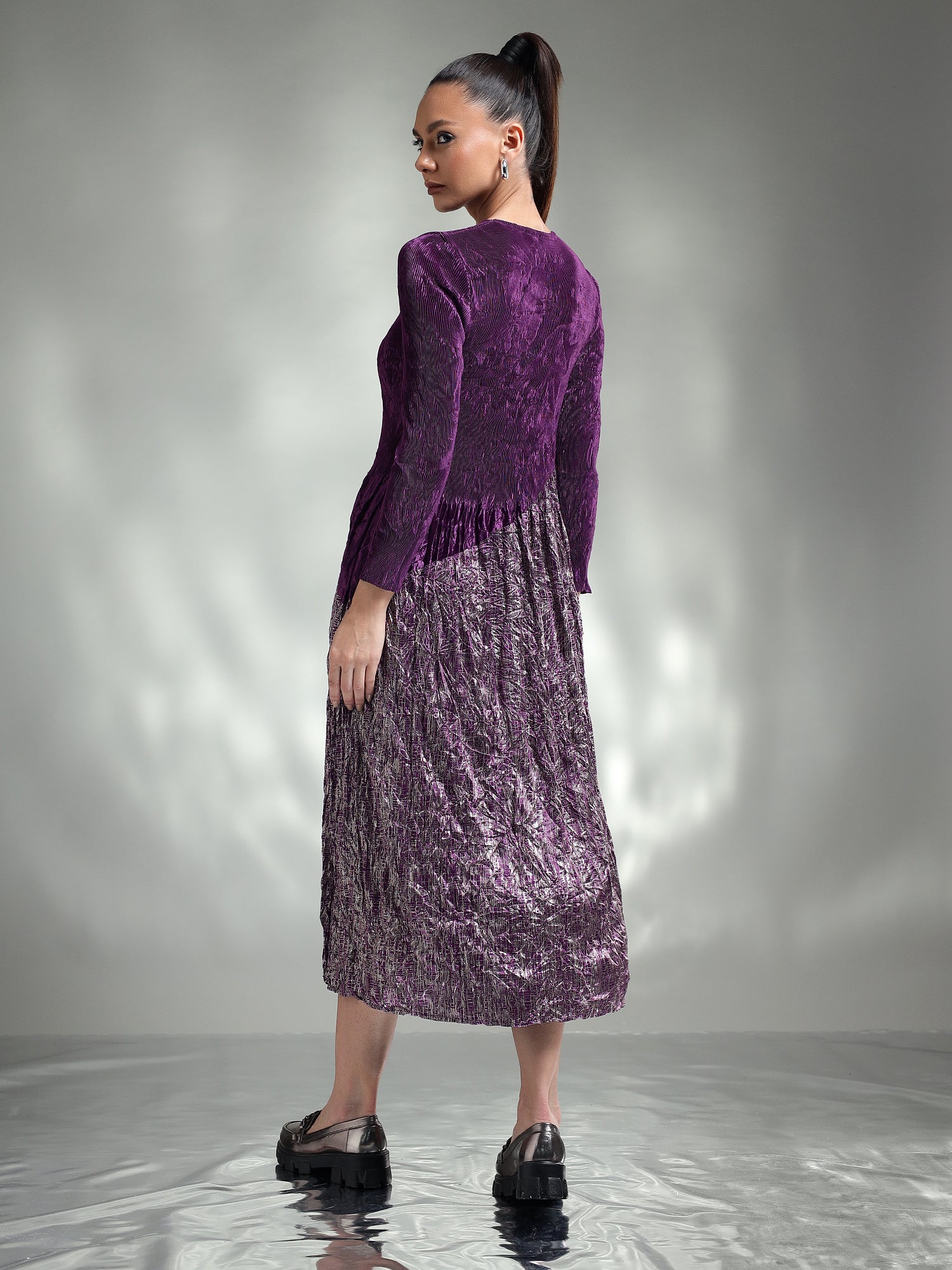 This stunning metallic dress in rich Purple and Olive Green brings a bold, shimmering statement to your wardrobe. Featuring a diagonal shimmer pattern across the dress, it catches the light beautifully, adding a touch of glamour and sophistication. The dress is cinched at the waist with a sleek belt, accentuating the silhouette and creating a flattering shape. Perfect for evening events, cocktail parties, or special occasions, this dress combines modern style with luxurious metallic detailing for a show-stopping look.