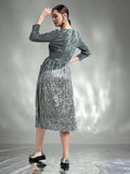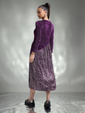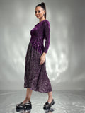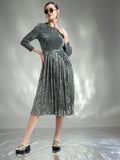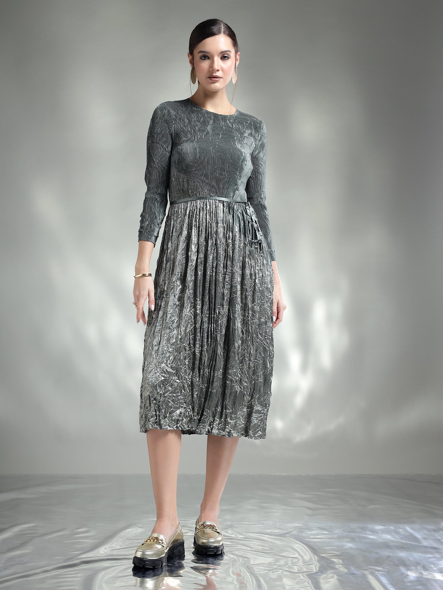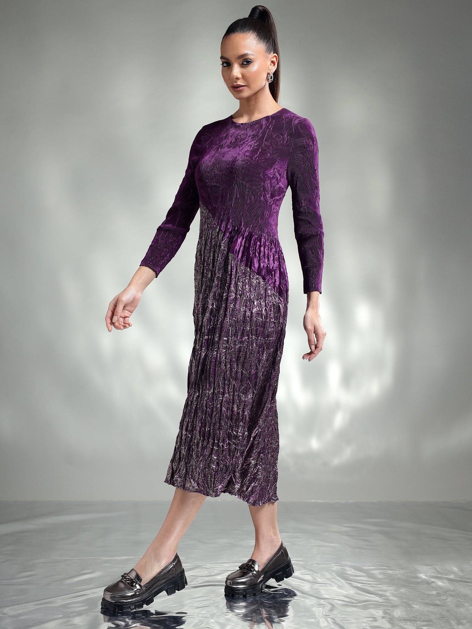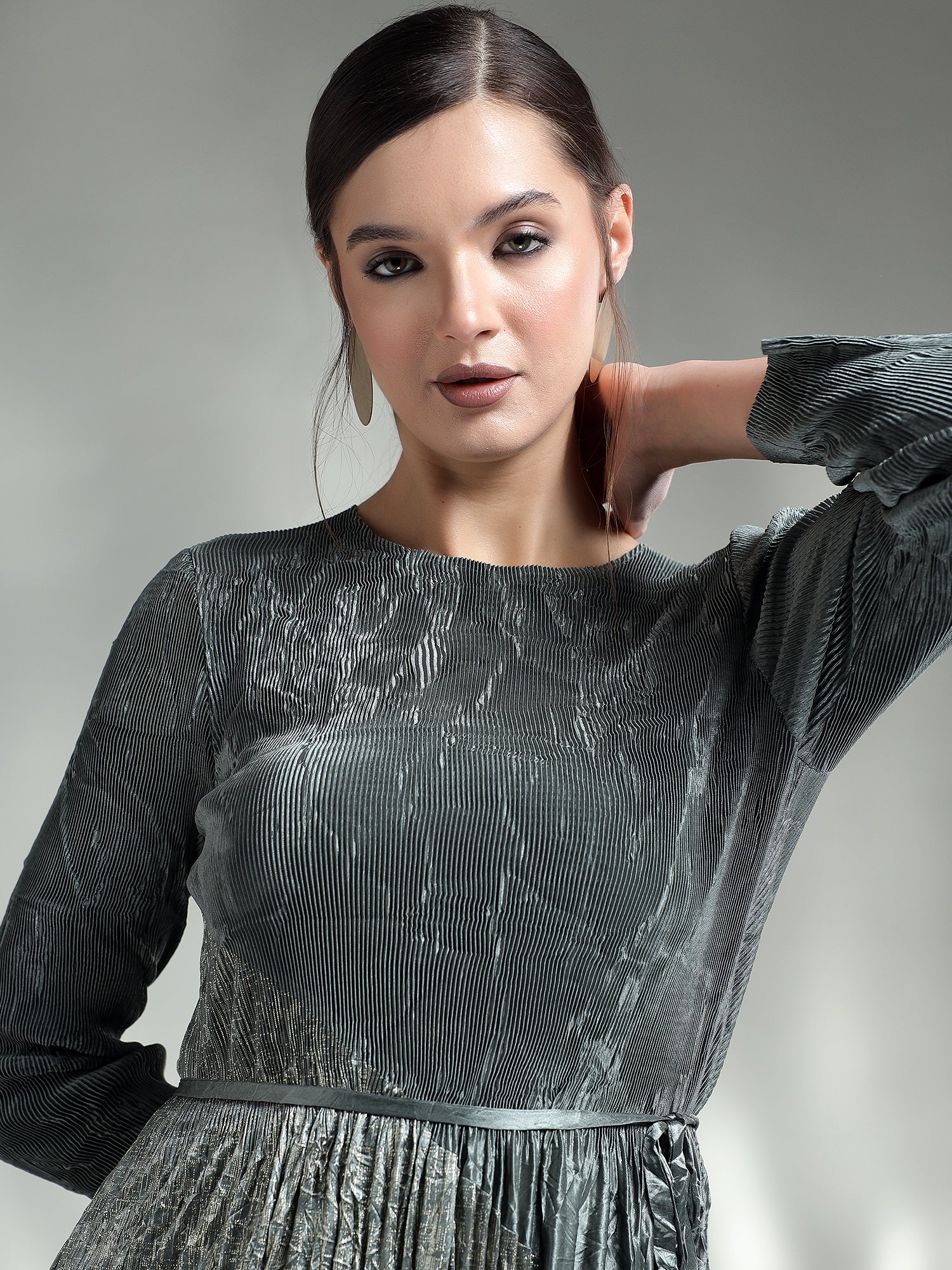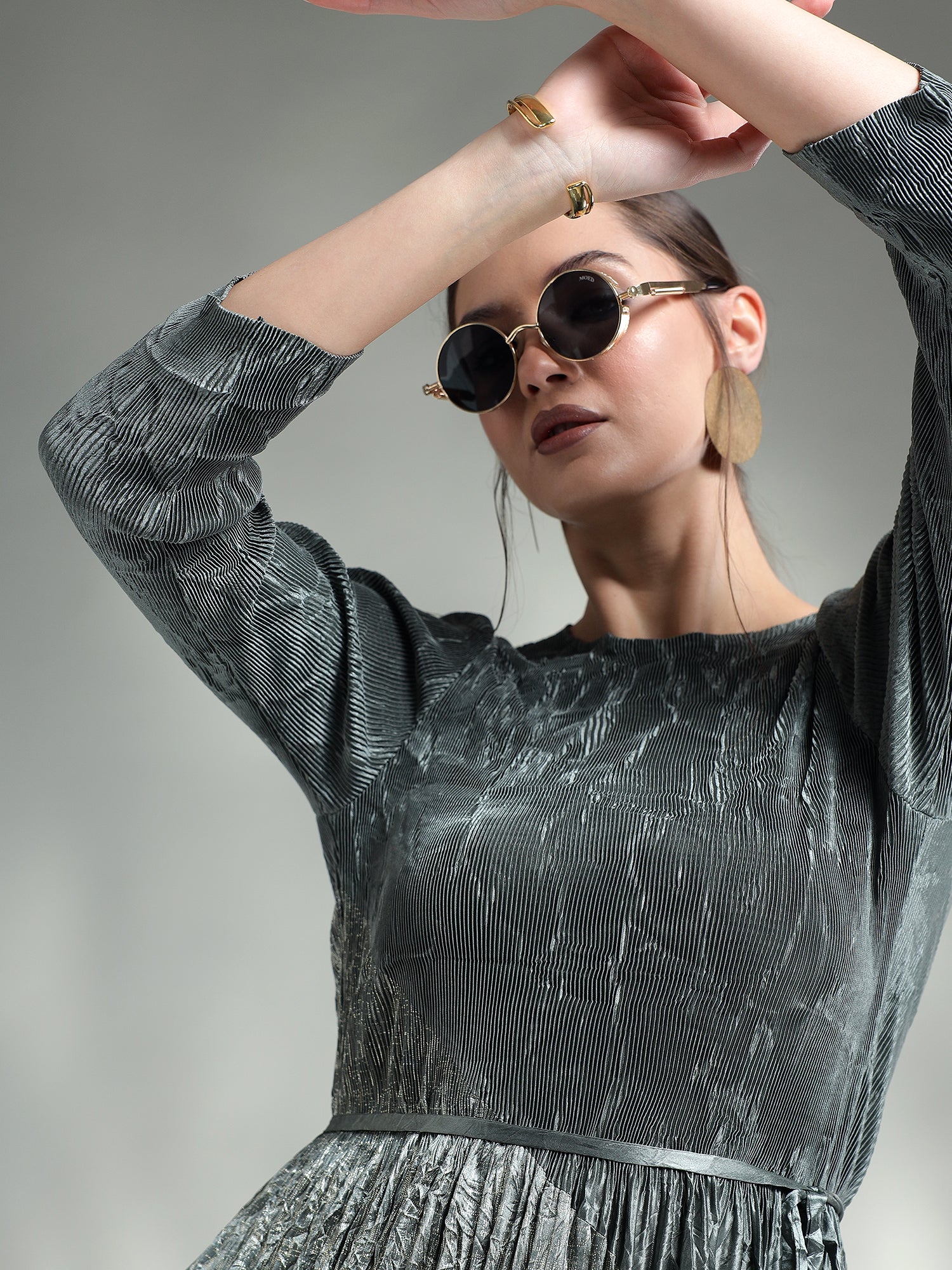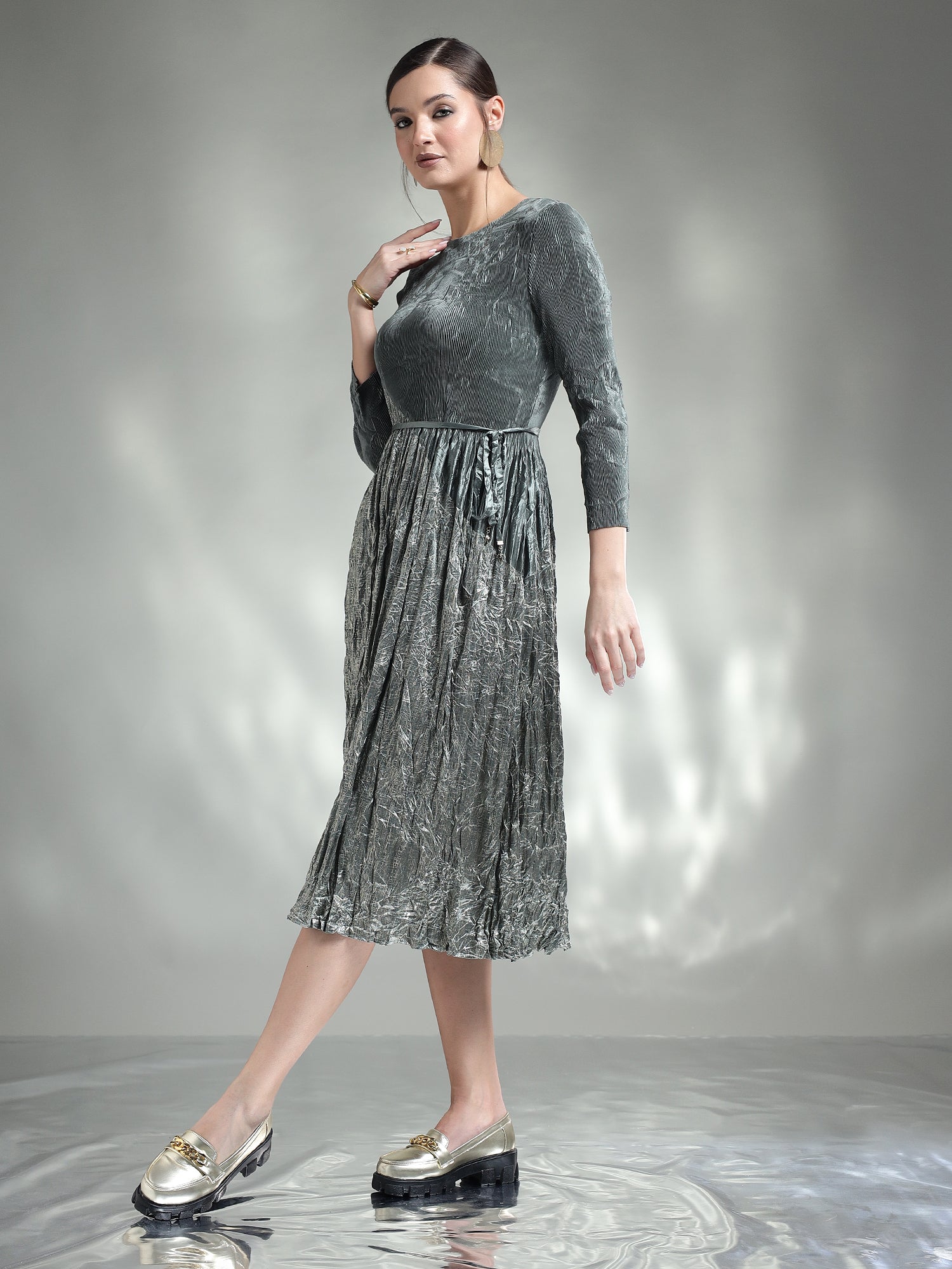 This stunning metallic dress in rich Purple and Olive Green brings a bold, shimmering statement to your wardrobe. Featuring a diagonal shimmer pattern across the dress, it catches the light beautifully, adding a touch of glamour and sophistication. The dress is cinched at the waist with a sleek belt, accentuating the silhouette and creating a flattering shape. Perfect for evening events, cocktail parties, or special occasions, this dress combines modern style with luxurious metallic detailing for a show-stopping look.