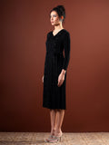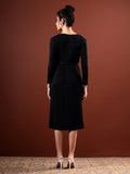 Elegant and timeless, this black embellished midi dress is designed to flatter with subtle detail and graceful movement. Crafted in a softly textured fabric, it features delicate tonal embellishments arranged along the bodice and skirt, adding a refined hint of sparkle. The V-neckline and long sleeves create a sleek, balanced silhouette, while the adjustable waist tie defines the shape effortlessly. Falling into a gentle A-line hem, this dress transitions seamlessly from evening gatherings to intimate celebrations, offering understated sophistication with every wear.