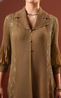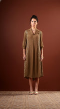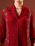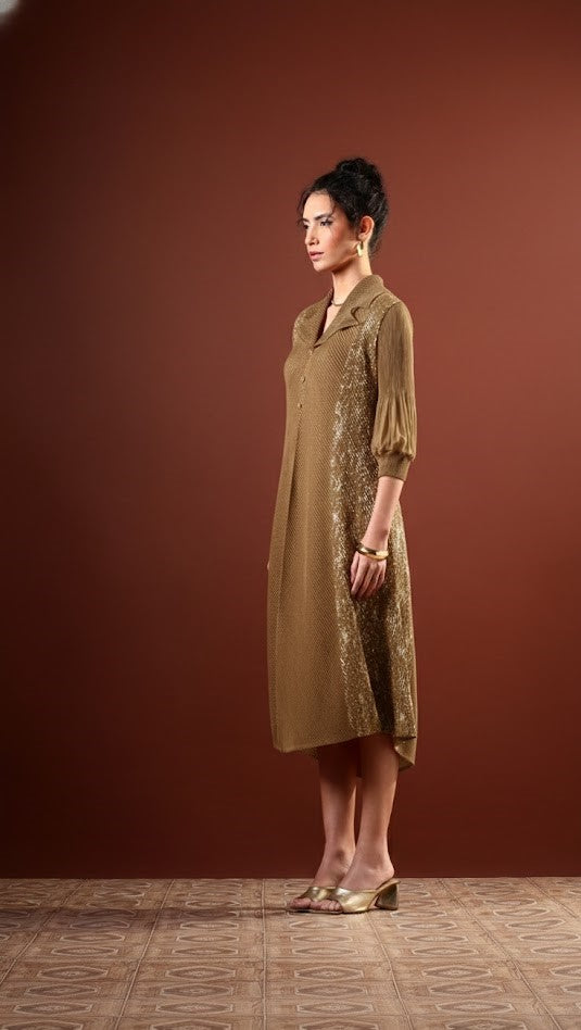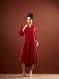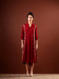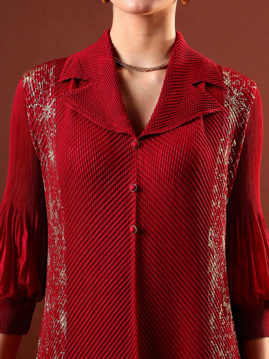Elevated with subtle shimmer and refined structure, this button-down midi dress is crafted for effortless sophistication. Designed in a warm red hue, it features textured paneling with delicate metallic accents along the sides, adding depth and a touch of understated glamour. The tailored collar and front button closure lend a polished finish, while the softly flared silhouette and three-quarter sleeves ensure comfort and ease. Perfect for festive gatherings, evening occasions, or refined daytime events, this dress blends modern elegance with timeless appeal.