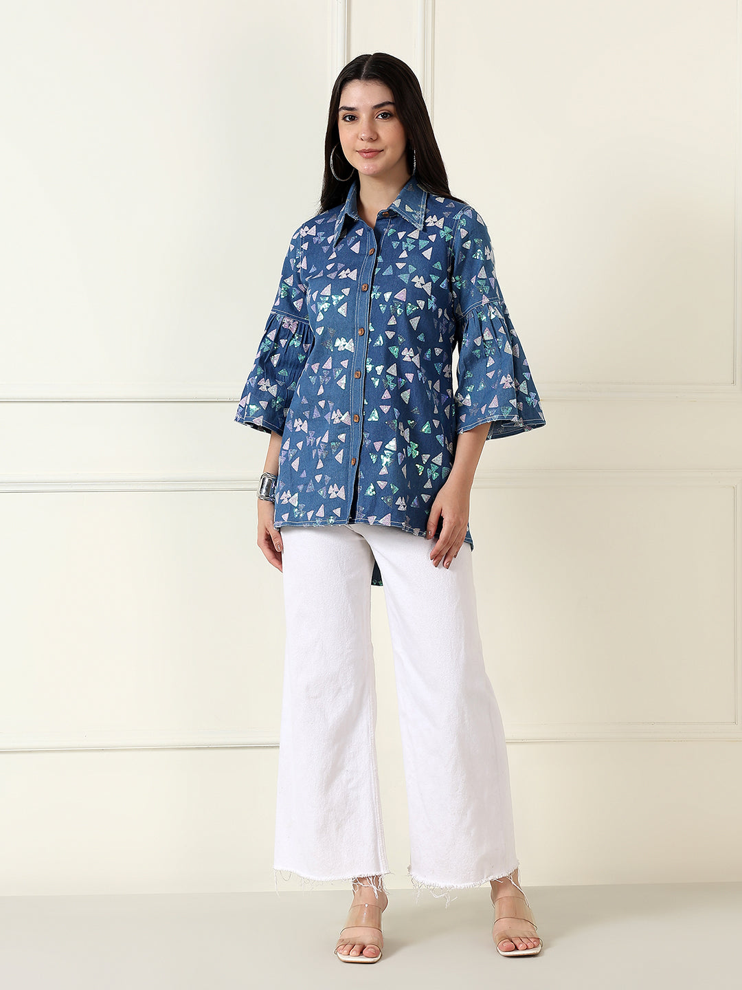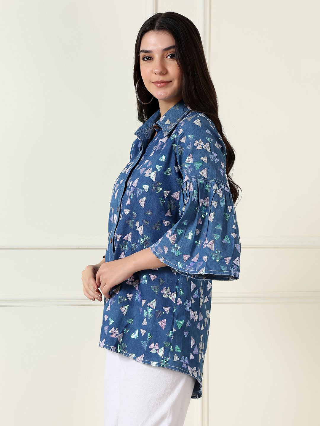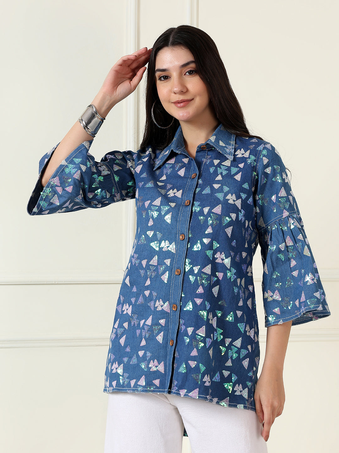 The Shimmerwave Denim Shirt blends classic charm with contemporary radiance. Crafted in denim-inspired fabric, it features iridescent geometric motifs that shimmer with every move. The structured collar and flared sleeves lend a refined silhouette — perfect for day-to-evening elegance. Pair it with ivory trousers or statement jewelry for a look that’s effortlessly chic yet undeniably exclusive.