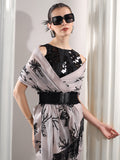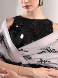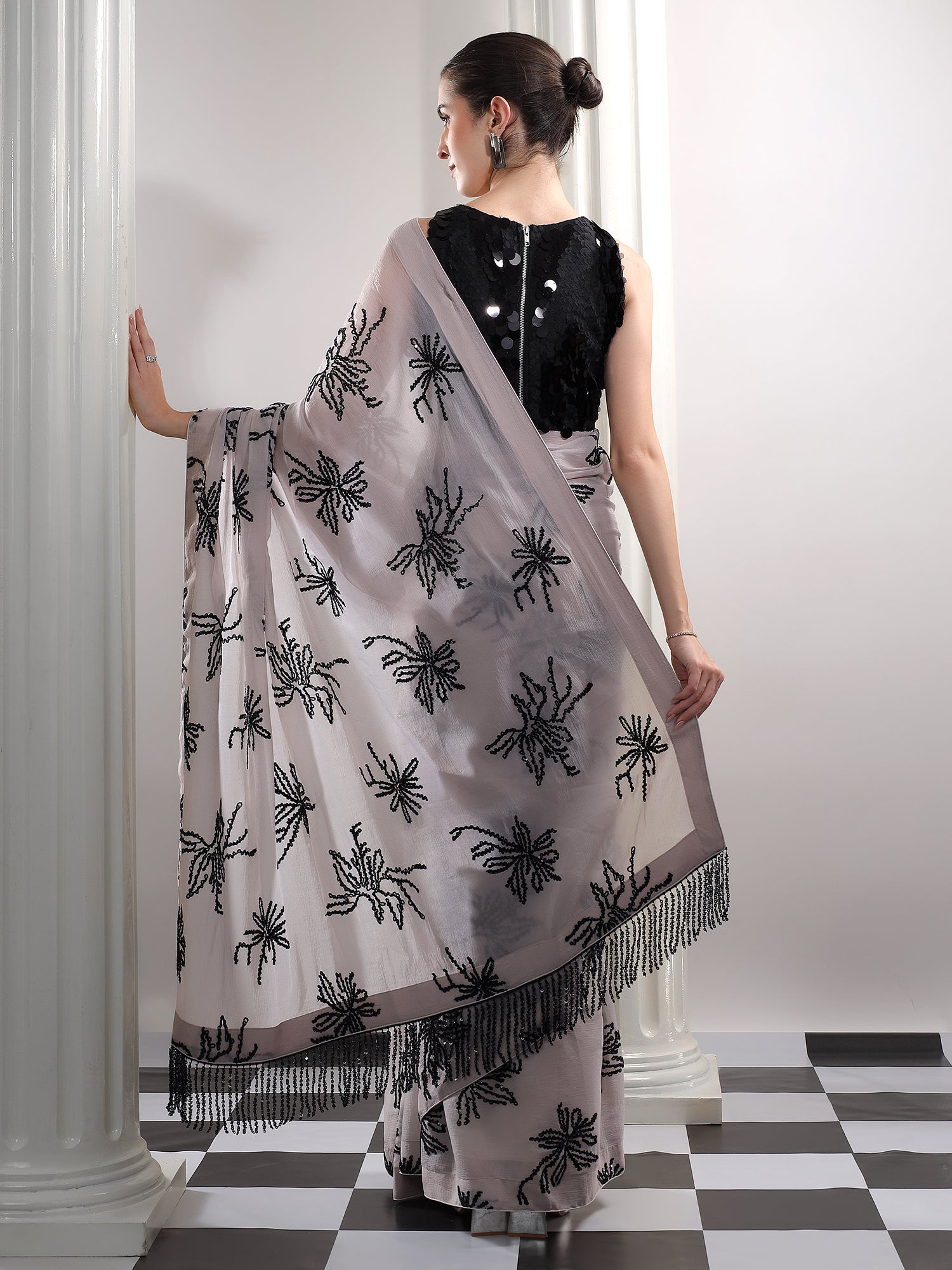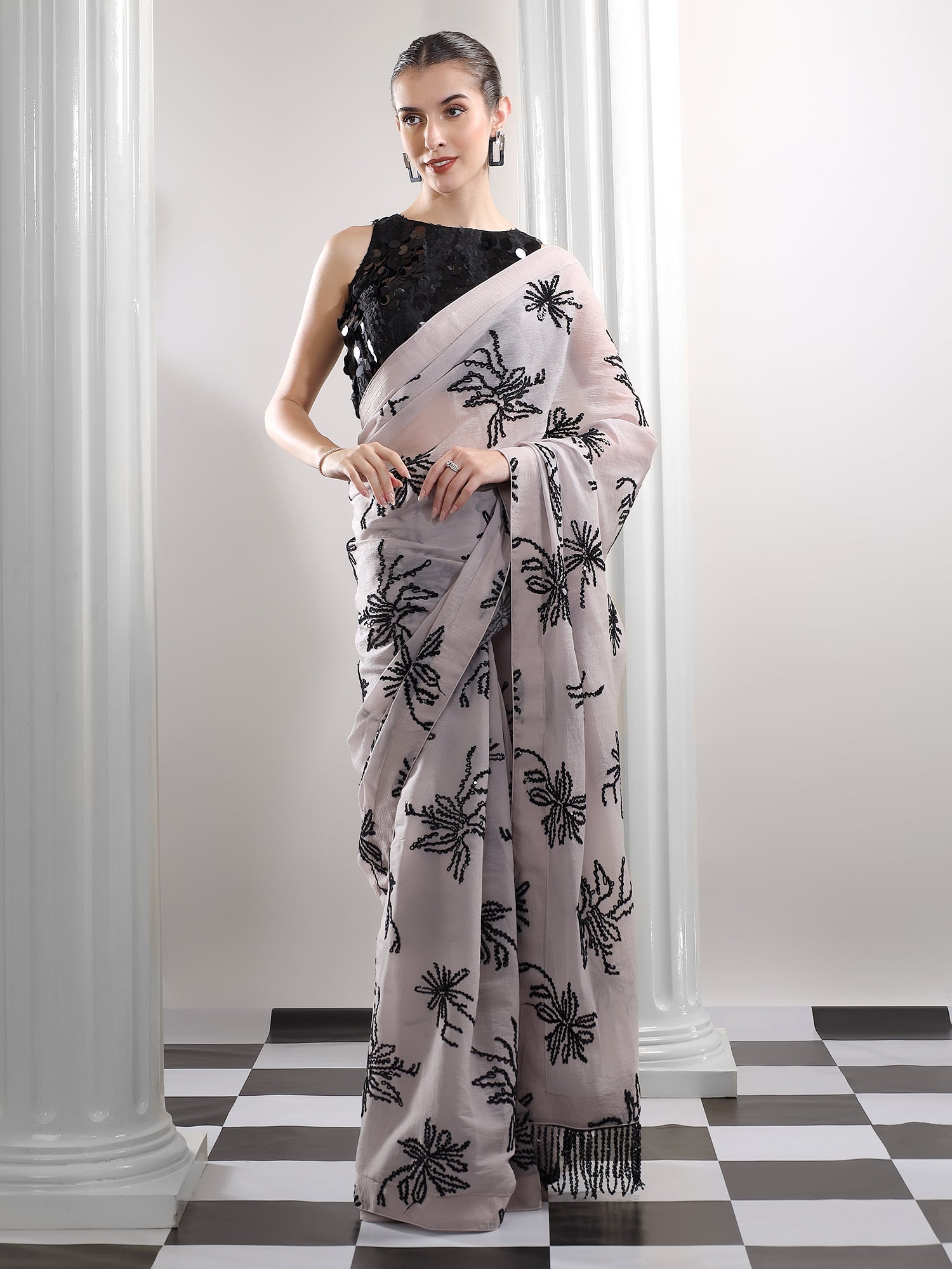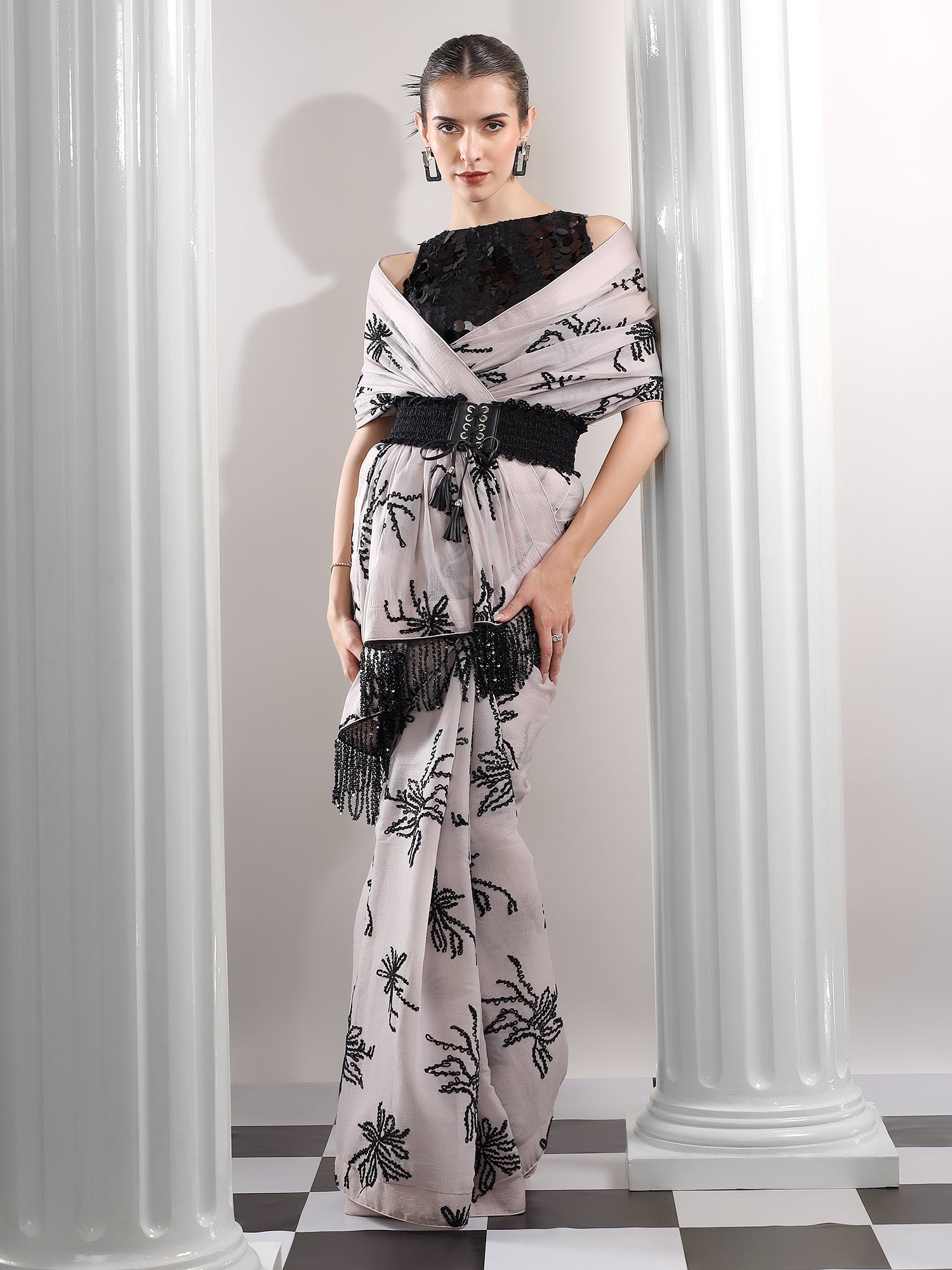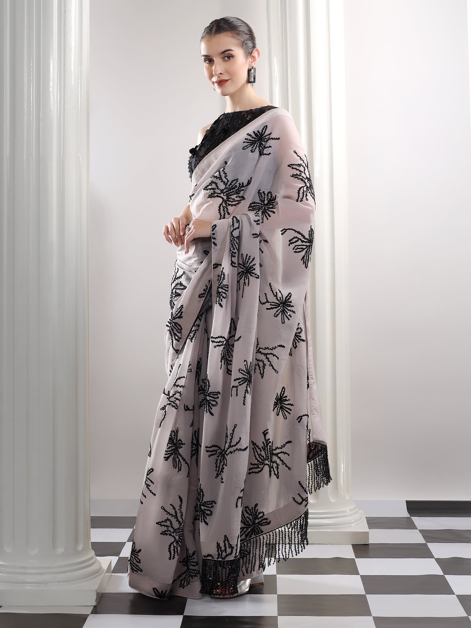 Paired with a sleek black embellished blouse, this saree is a statement in understated luxury, embodying sophistication with every drape.