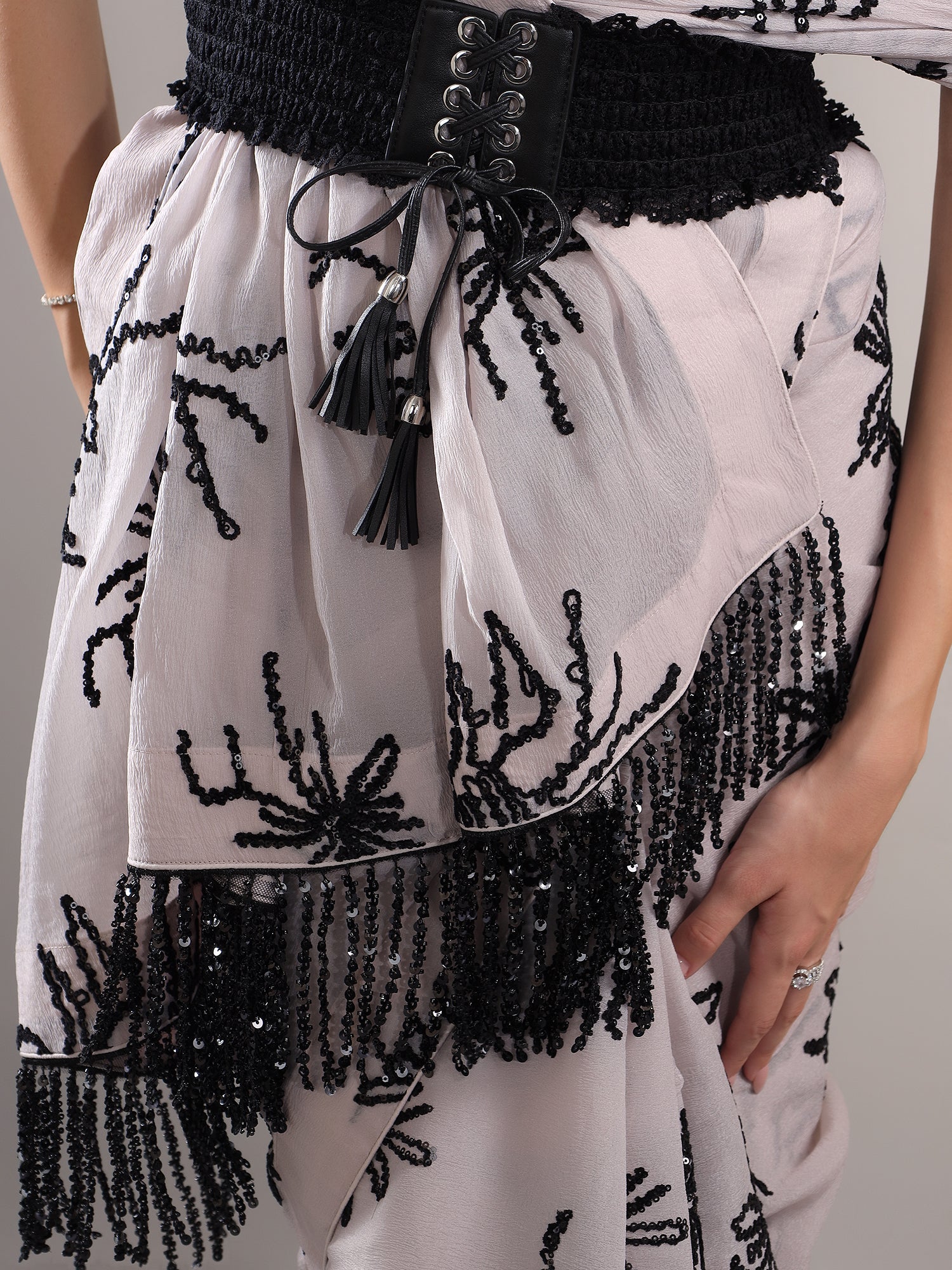 A symphony of grace and glamour, the Noir Bloom Saree is designed for the modern muse who embraces elegance with an edge. The soft, muted base provides the perfect canvas for intricate black sequin embroidery, forming floral motifs that exude timeless charm. The delicate fringe detail along the border adds a contemporary twist, making this saree a standout piece for evening galas, cocktail events, or wedding receptions.