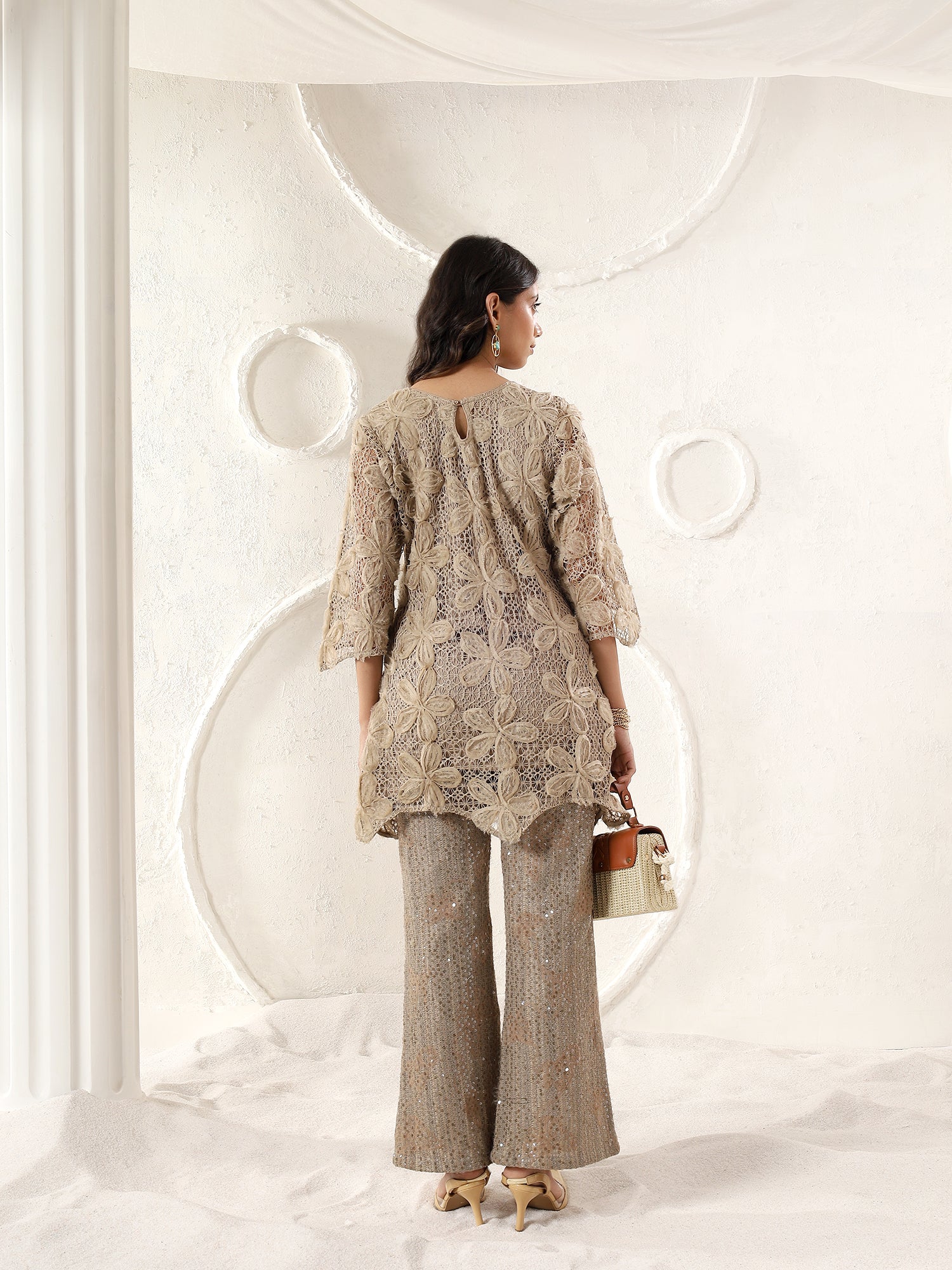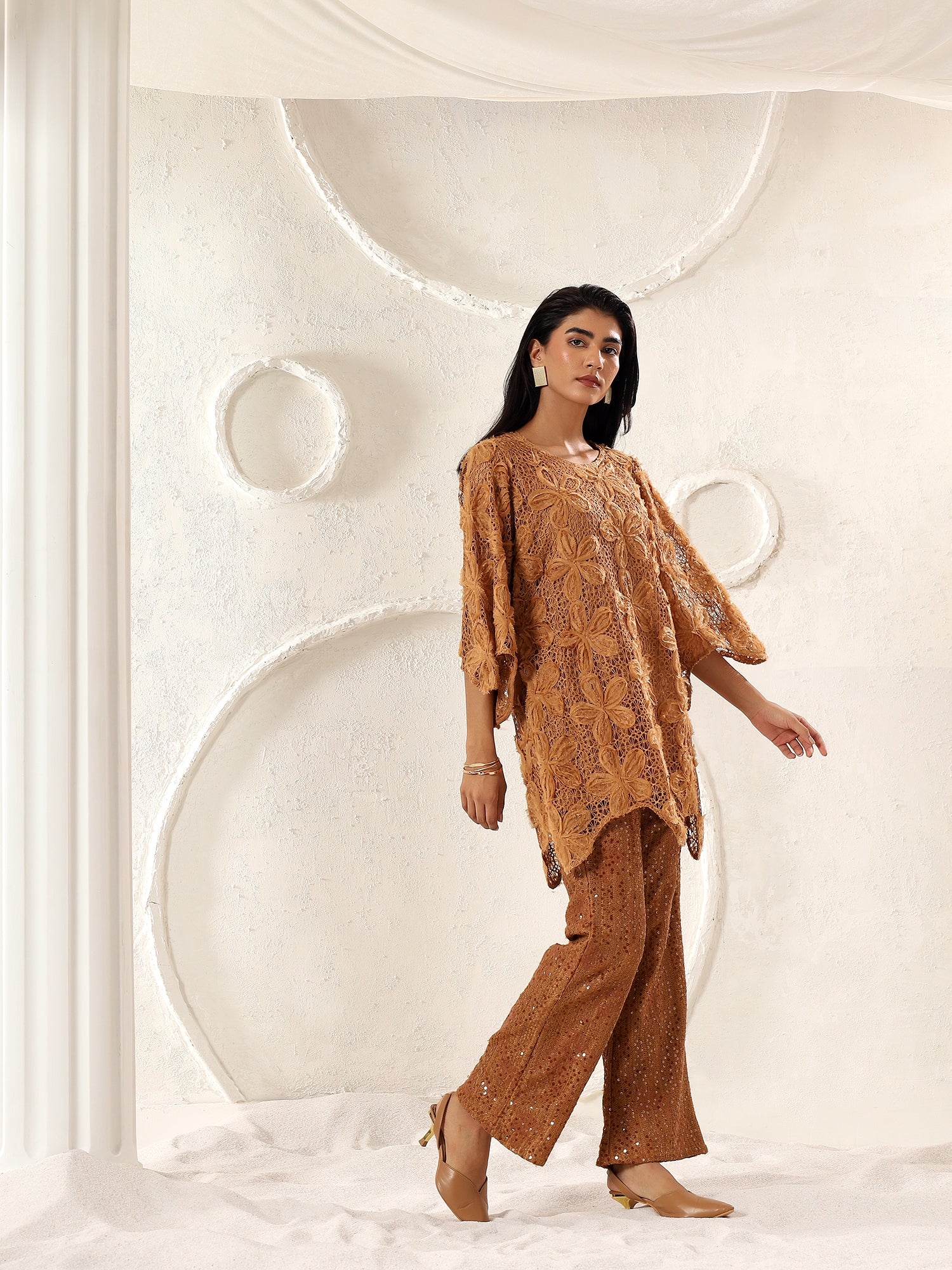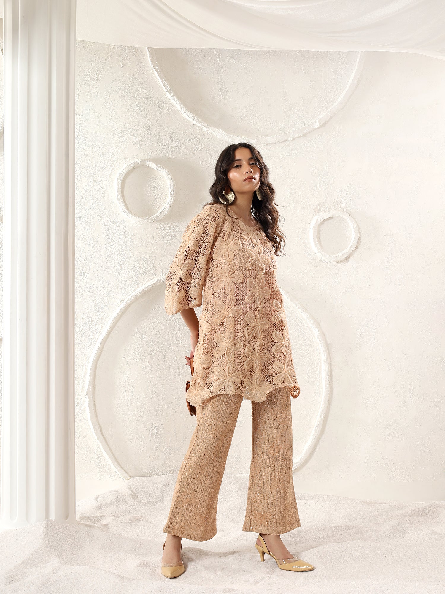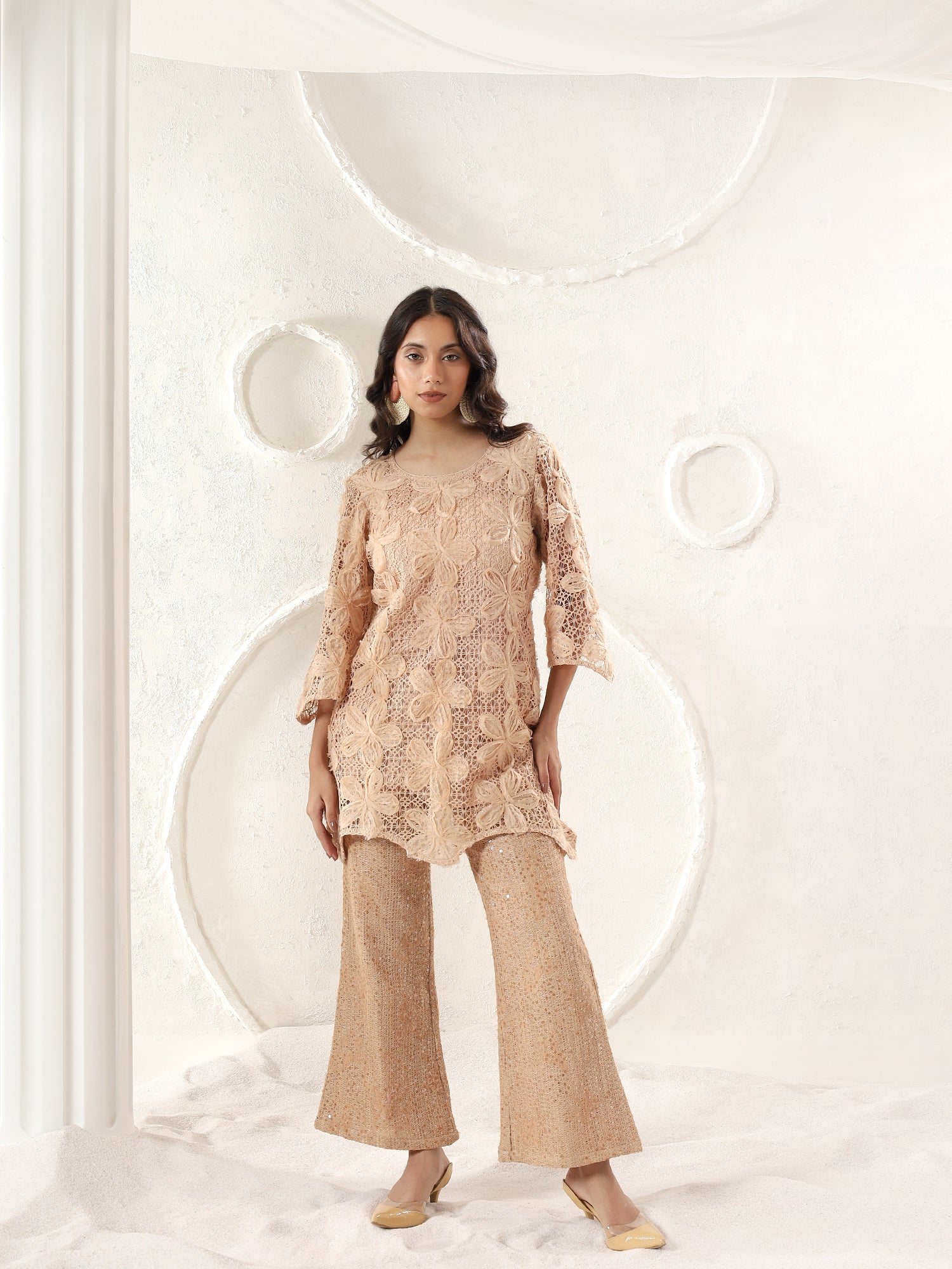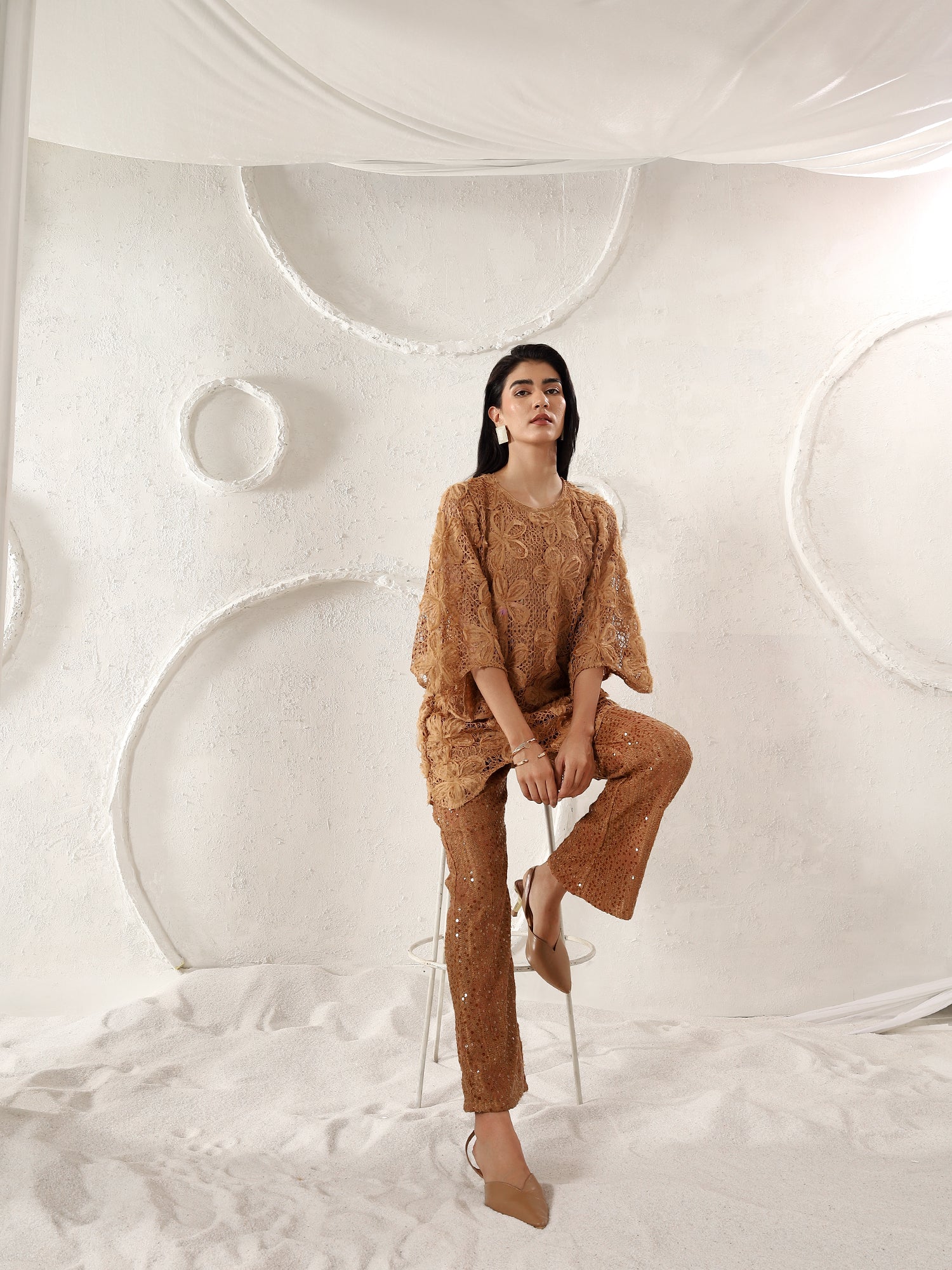 Power meets poise in our Solene Sequin Co-Ord. A rich bronze floral lace top with a scalloped hem paired with shimmer-infused sequin pants makes this set a standout for elegant evening affairs. Think cocktails, celebrations, or a luxe festive moment — this look does it all with grace.