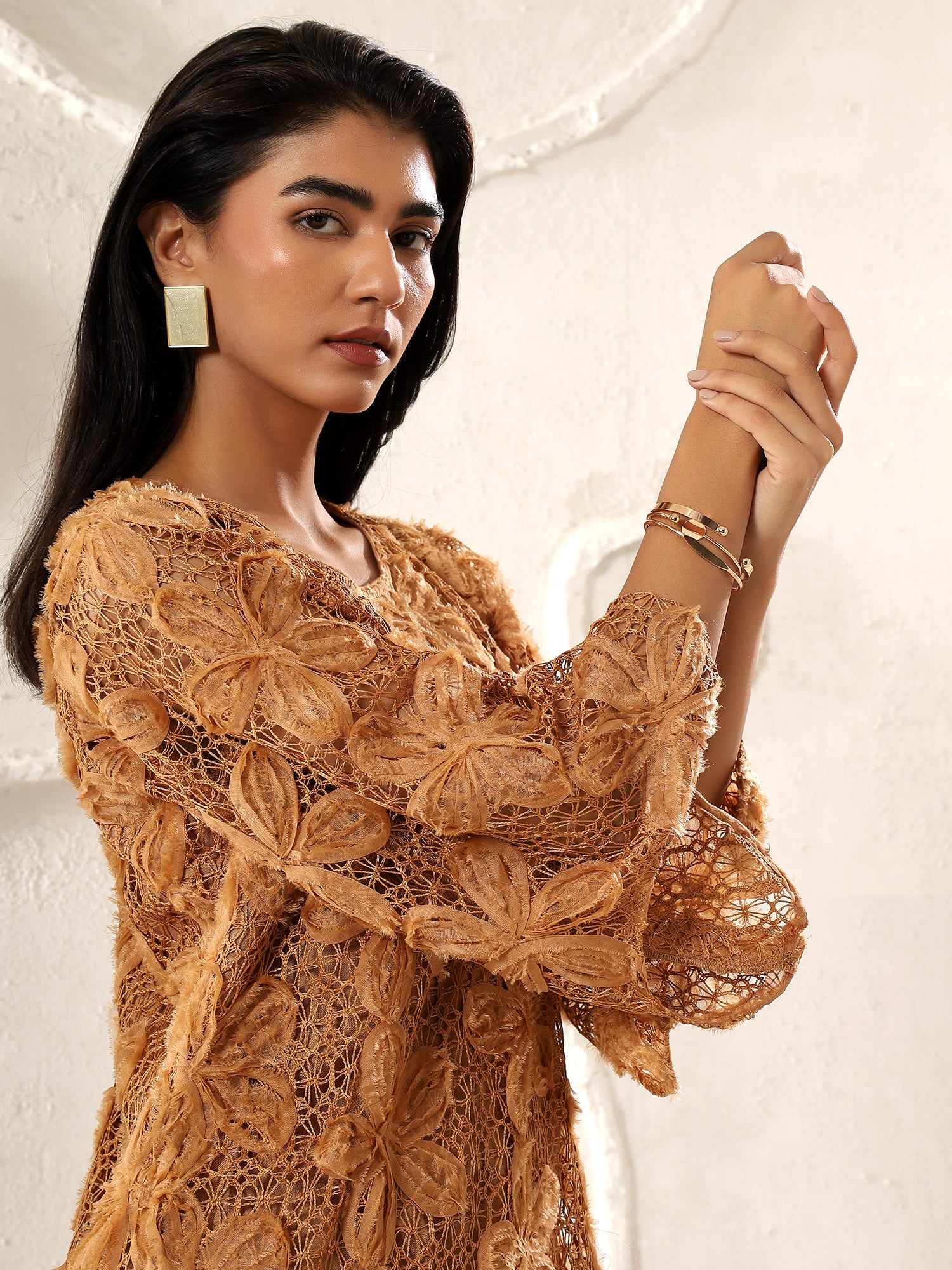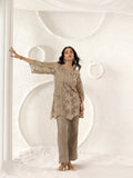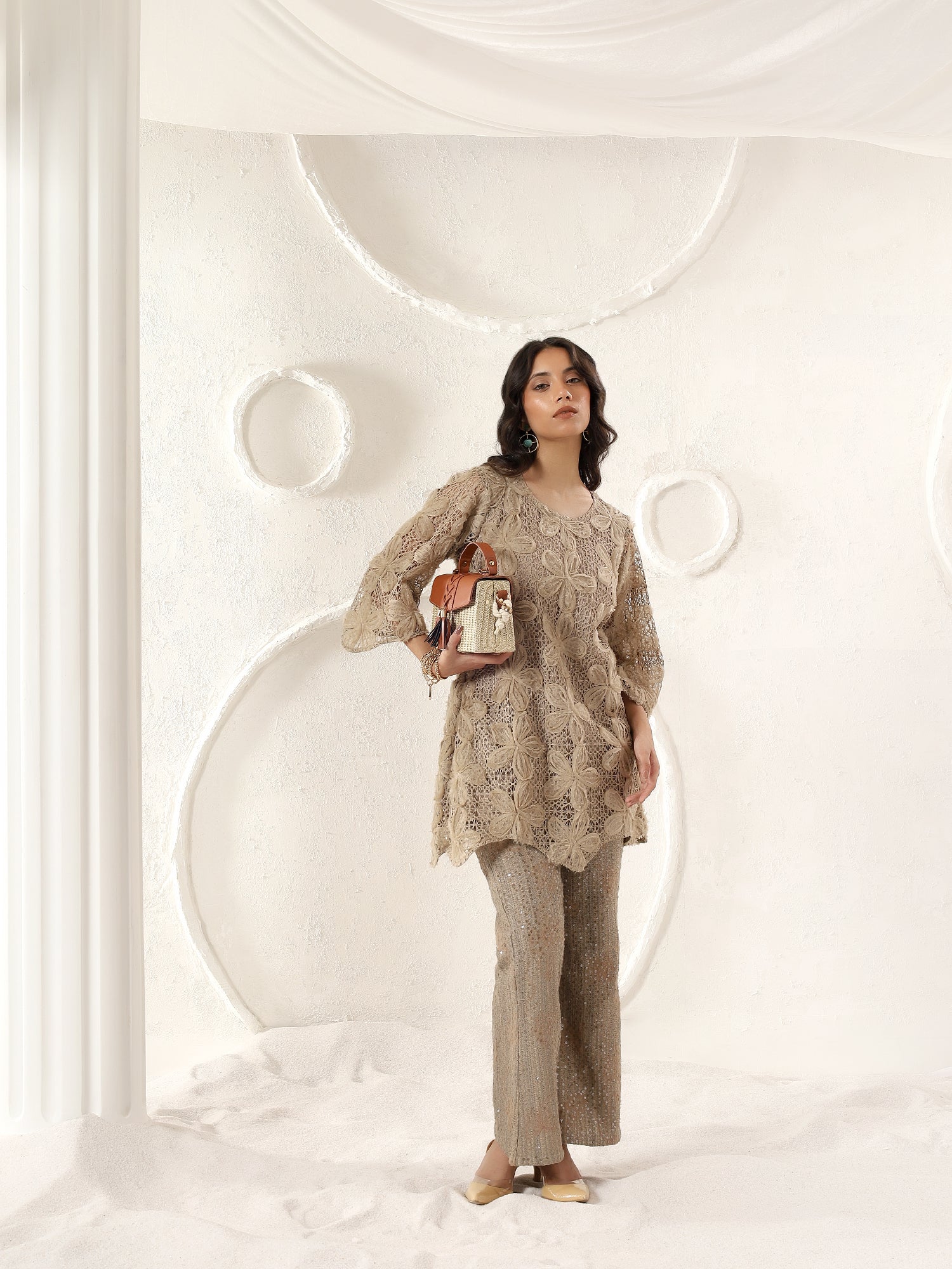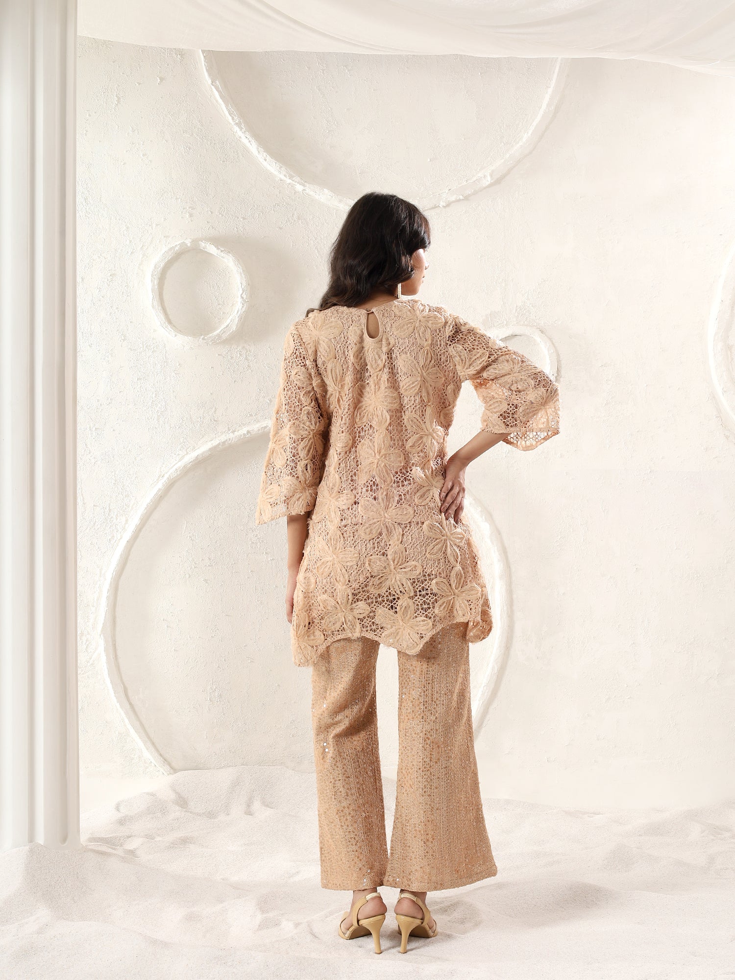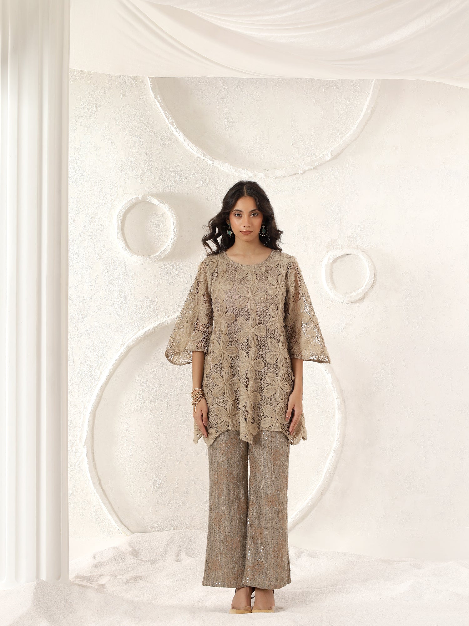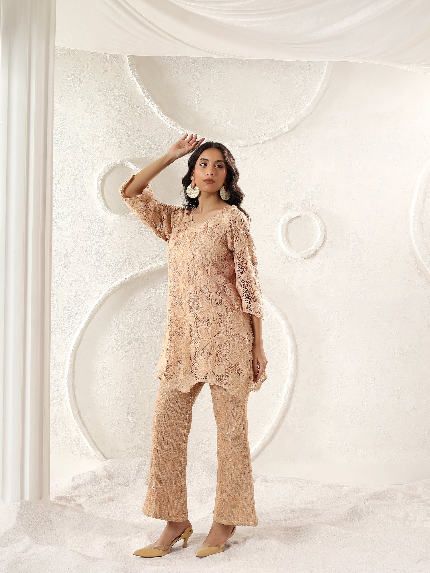 Power meets poise in our Solene Sequin Co-Ord. A rich bronze floral lace top with a scalloped hem paired with shimmer-infused sequin pants makes this set a standout for elegant evening affairs. Think cocktails, celebrations, or a luxe festive moment — this look does it all with grace.