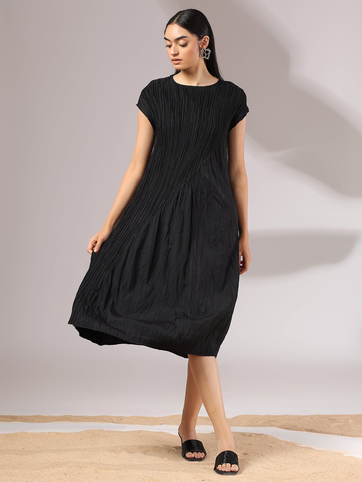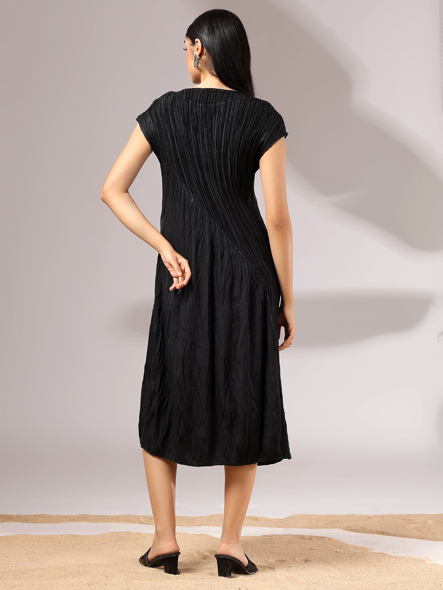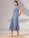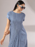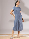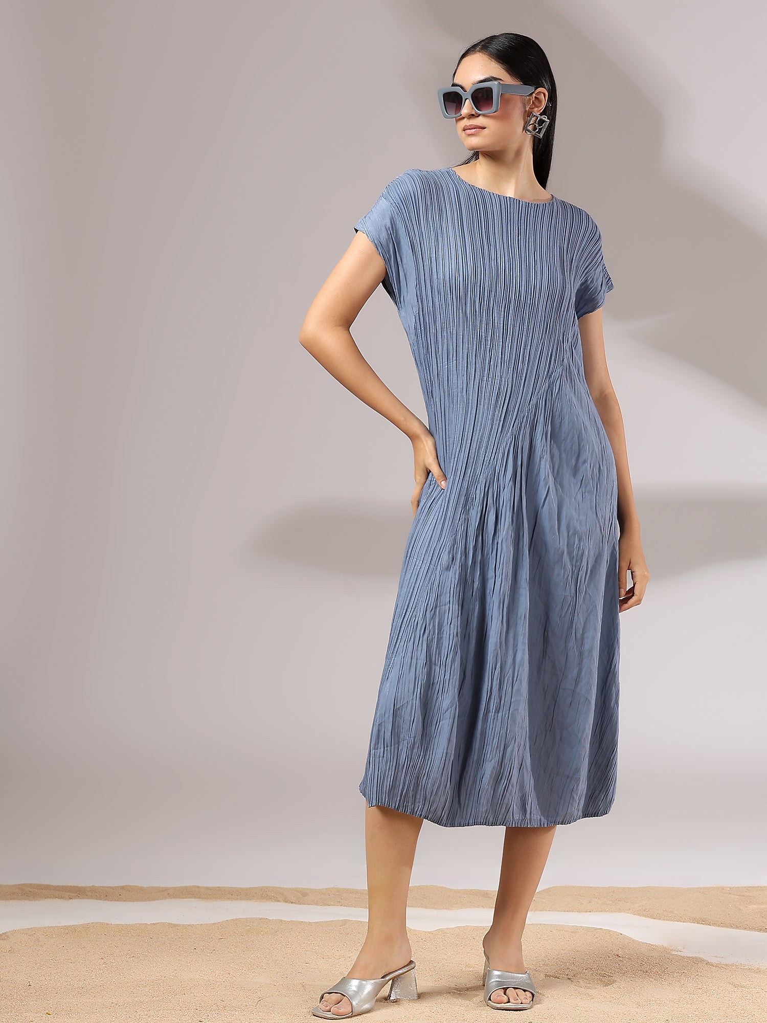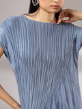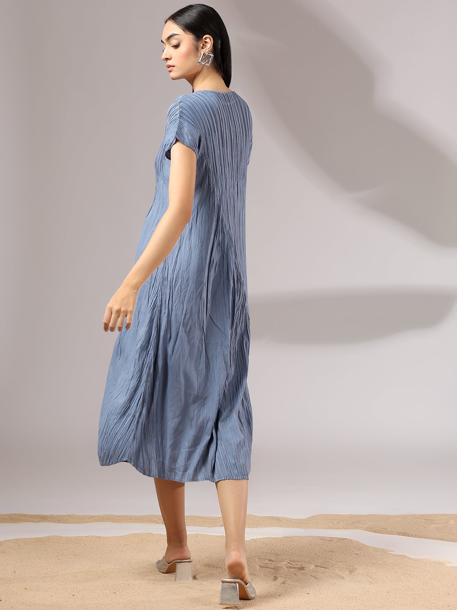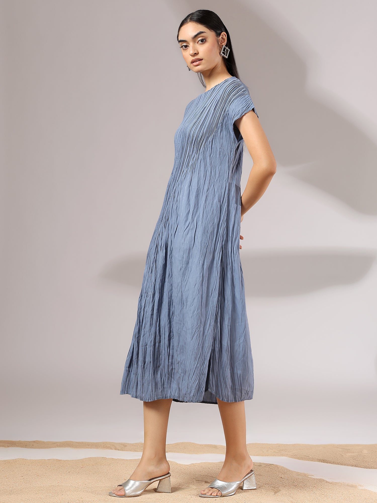 Light as air and endlessly versatile, Sora is a midi dress crafted in a soft, crinkled pleated texture that flows with graceful ease. Its minimal silhouette is elevated by fine detailing—cap sleeves, gentle drape, and a serene blue hue that feels like sky at dusk. Whether styled with bold accessories or worn on its own, Sora is the embodiment of understated elegance and modern femininity.