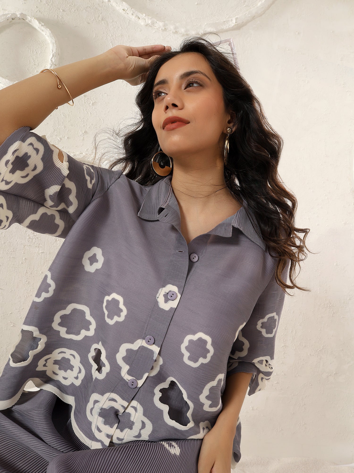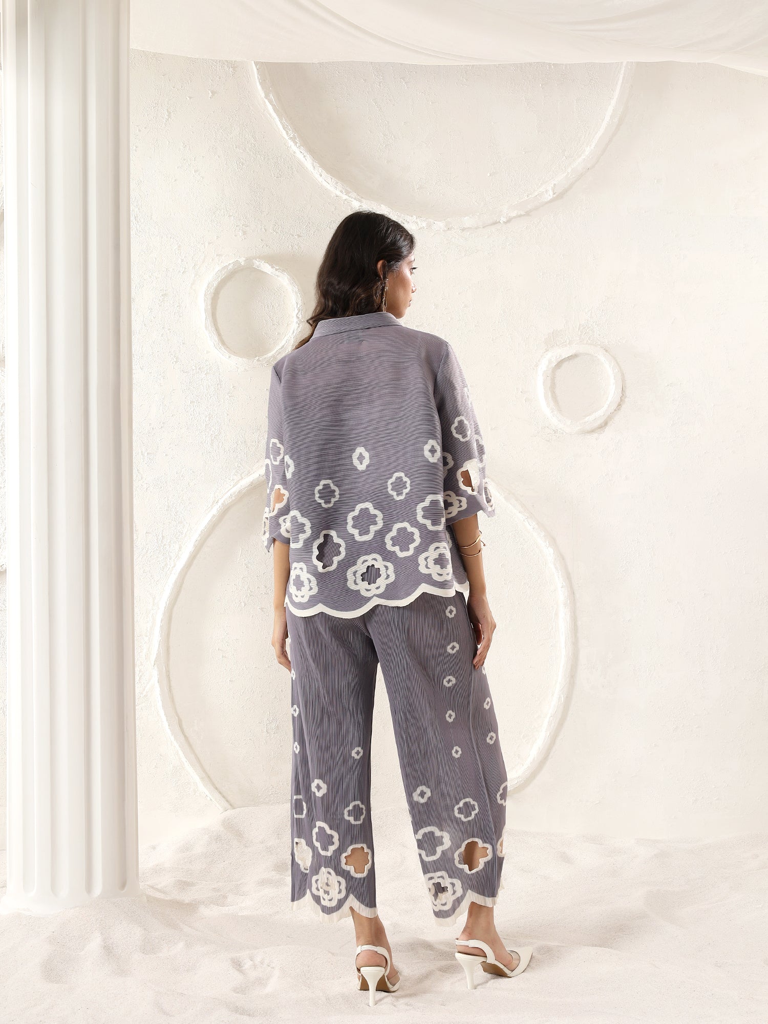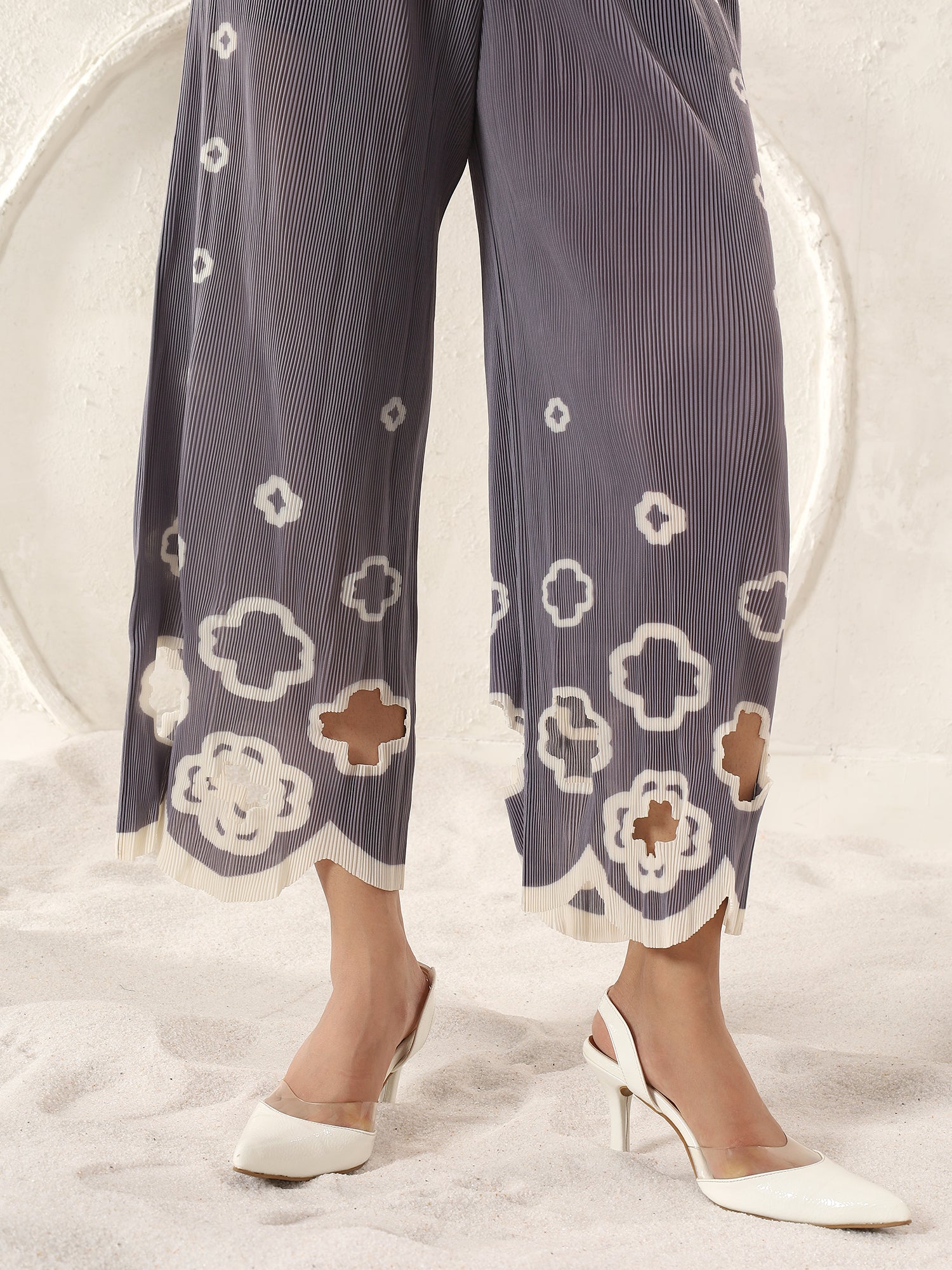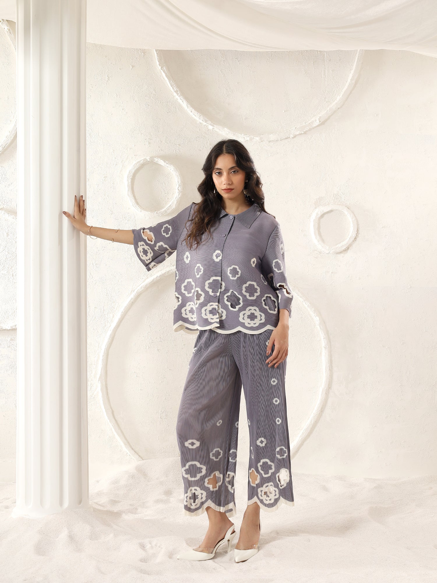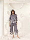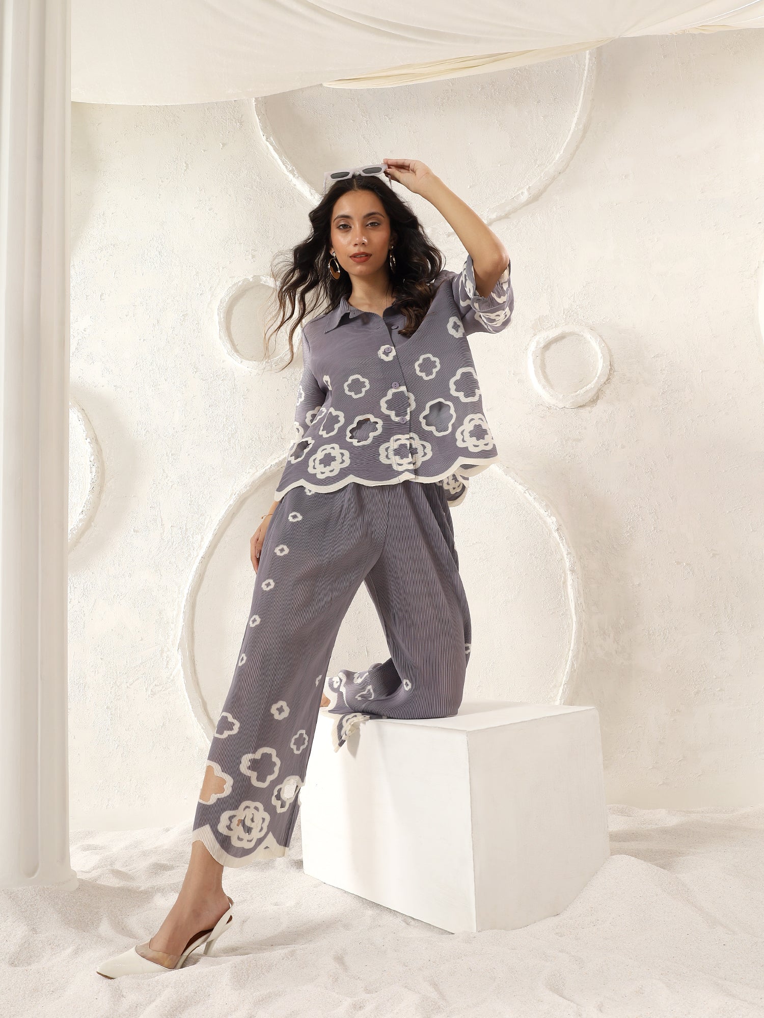 Step into easy elegance with our Baroque Coord Set, featuring a Grey base adorned with abstract white floral motifs. Crafted in pleated fabric for comfort and fluidity, the set includes a relaxed-fit top with scalloped edges and a matching pair of straight pants. Perfect for brunches, travel, or cozy chic evenings, this set is where playful design meets everyday style.