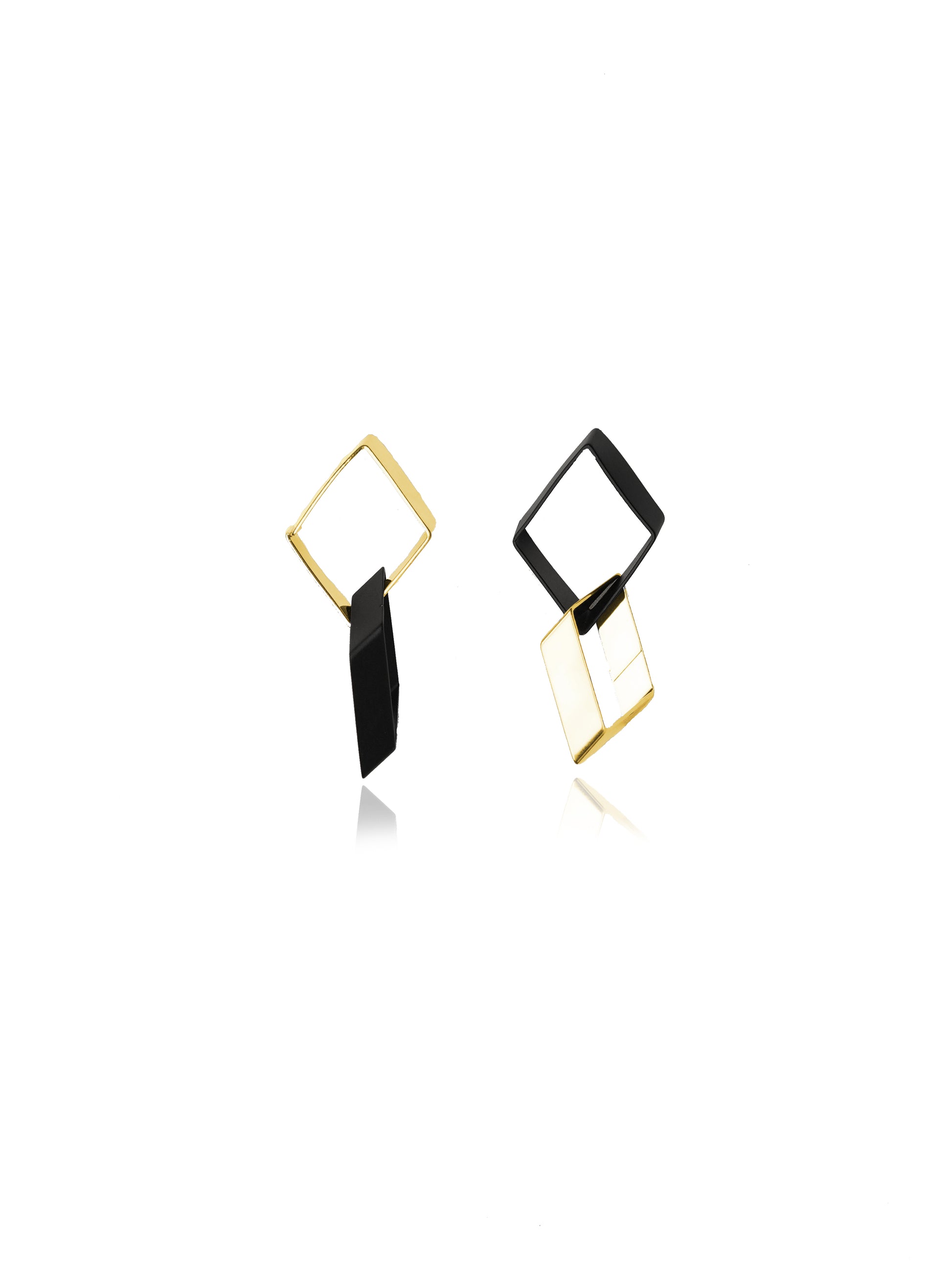 The earring in the image features a unique, modern geometric design. It's composed of interlocking twisted shapes, with a combination of glossy black and metallic finishes. This creates a striking visual contrast and a contemporary feel.