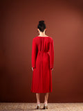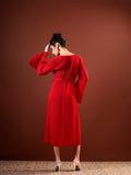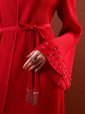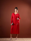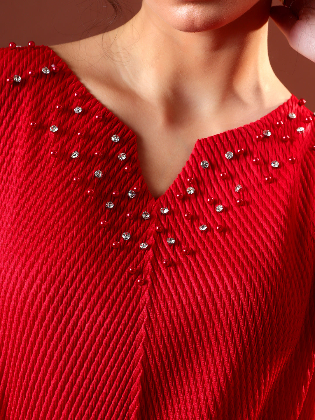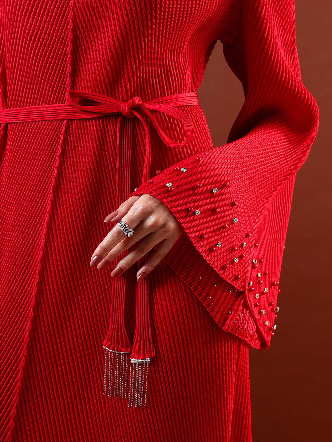 Designed to make a refined statement, this embellished midi dress blends elegance with effortless comfort. Crafted in a softly pleated fabric, it features delicate bead detailing along the V-neckline and sleeve cuffs, adding a subtle touch of shimmer. The relaxed silhouette is cinched at the waist with a tie-up belt for a flattering fit, while the midi length lends graceful movement. Perfect for festive evenings, celebrations, or elegant gatherings, this dress is a timeless addition to your occasion wardrobe.