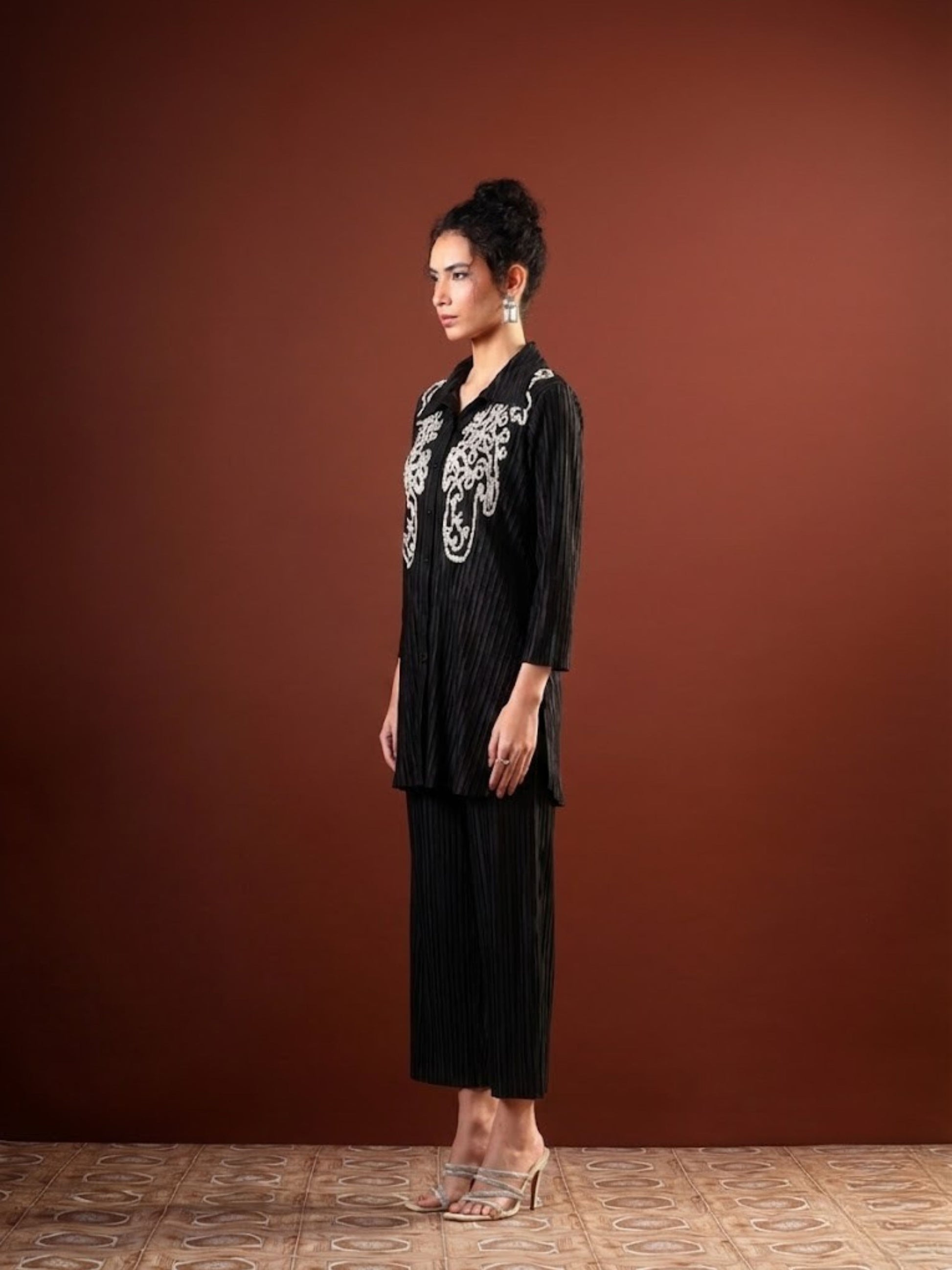 This elegant embroidered co-ord set blends classic craftsmanship with a modern silhouette. Crafted in a rich, pleated fabric, the button-down kurta features intricate tonal embroidery across the front, adding depth and refined detail. Designed with a structured collar and full sleeves, it offers a polished yet comfortable fit. Paired with straight-cut pants that complete the look with effortless ease, this set is perfect for festive gatherings, intimate celebrations, or elevated day-to-evening wear. A timeless ensemble that balances tradition with contemporary charm.