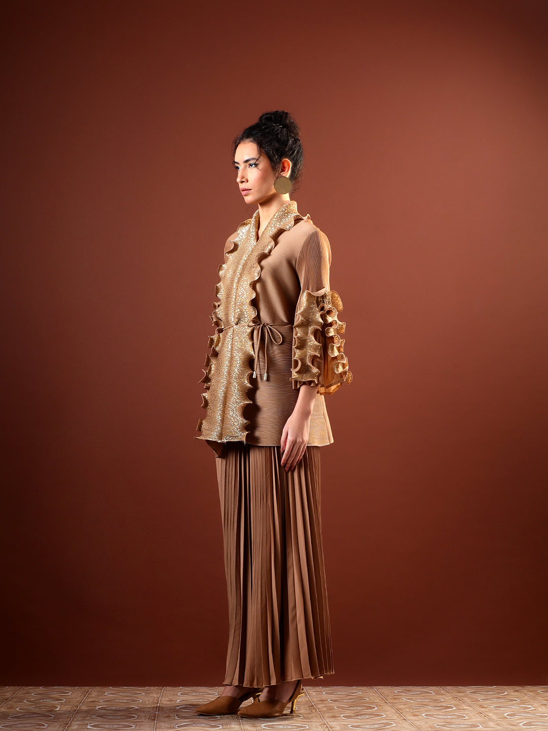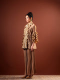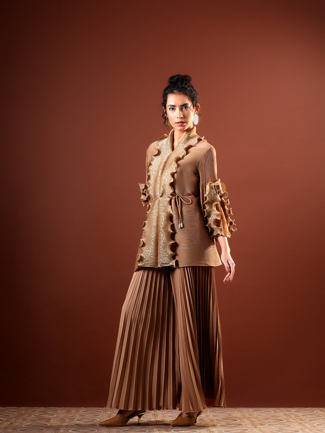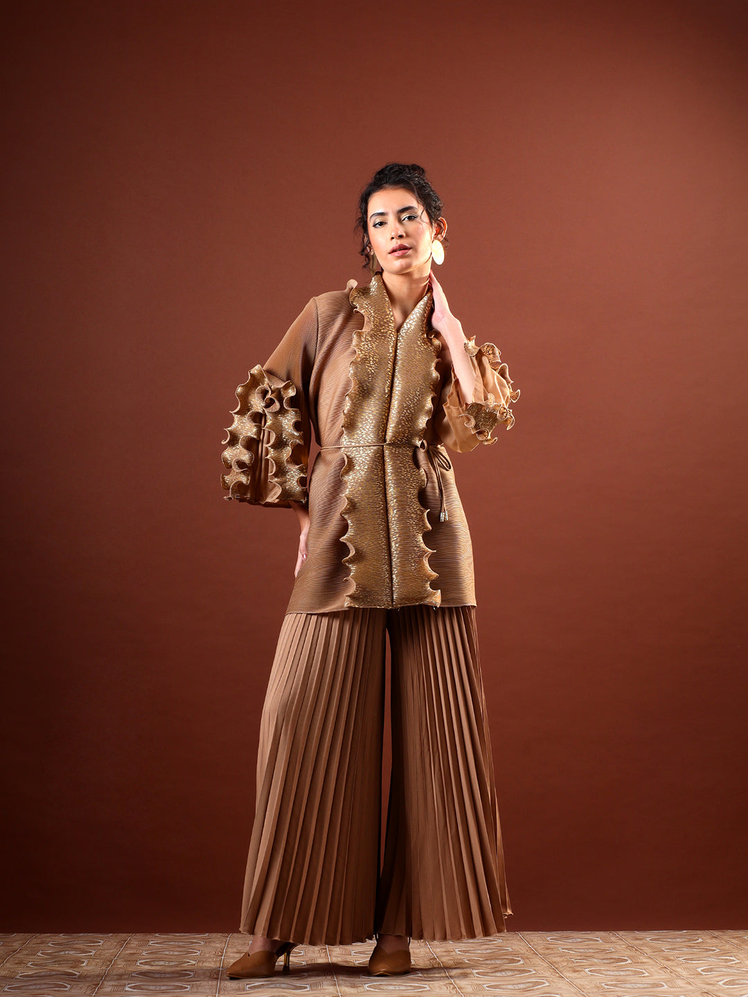Paired with high-waist pleated wide-leg pants, the ensemble balances structure with effortless flow. The warm neutral tone and shimmering accents make it perfect for evening celebrations, festive gatherings, and elevated occasion wear. Style it with minimal jewellery and heels for a sophisticated, contemporary finish.