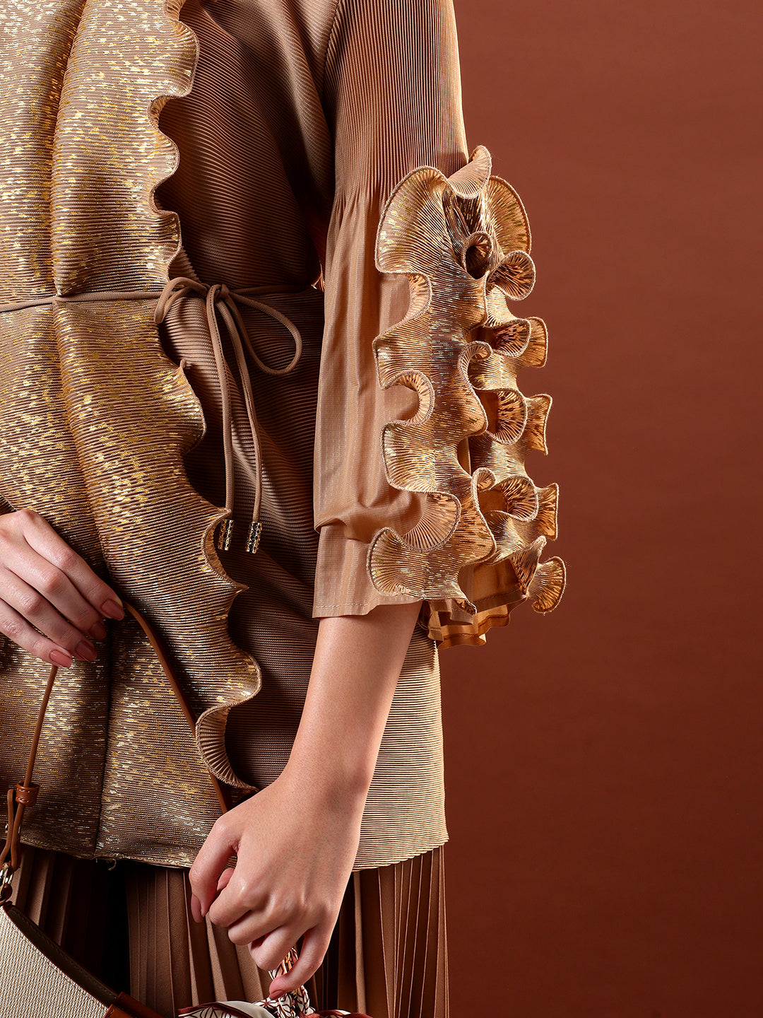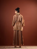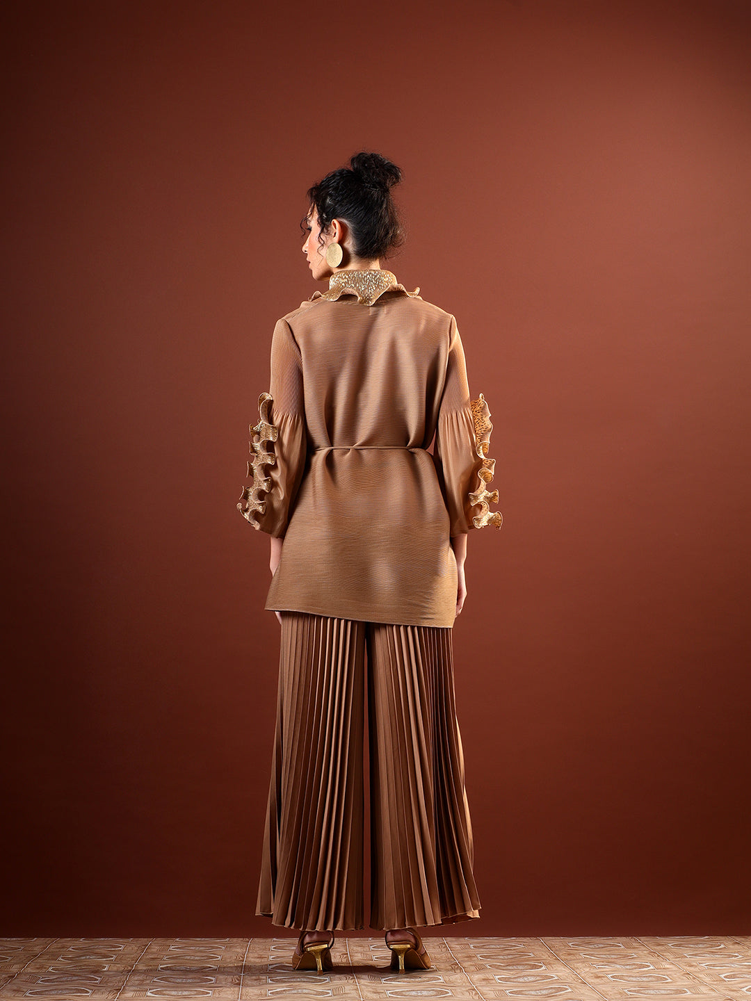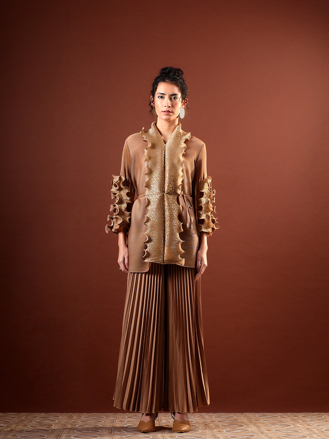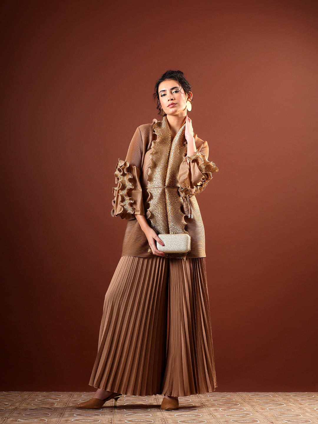 Paired with high-waist pleated wide-leg pants, the ensemble balances structure with effortless flow. The warm neutral tone and shimmering accents make it perfect for evening celebrations, festive gatherings, and elevated occasion wear. Style it with minimal jewellery and heels for a sophisticated, contemporary finish.