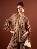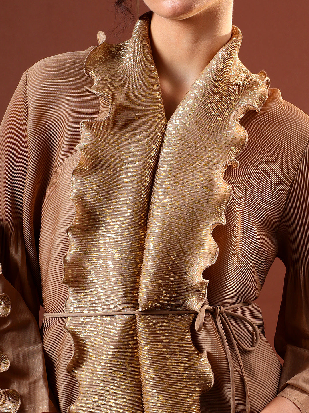 This elegant metallic ruffle co-ord set is a refined statement in modern festive dressing. The longline jacket features sculpted ruffle detailing along the front placket and sleeves, highlighted with subtle metallic texture that adds depth and movement. Designed with a soft tie-up waist, it offers a flattering, adjustable silhouette while maintaining a fluid drape.