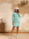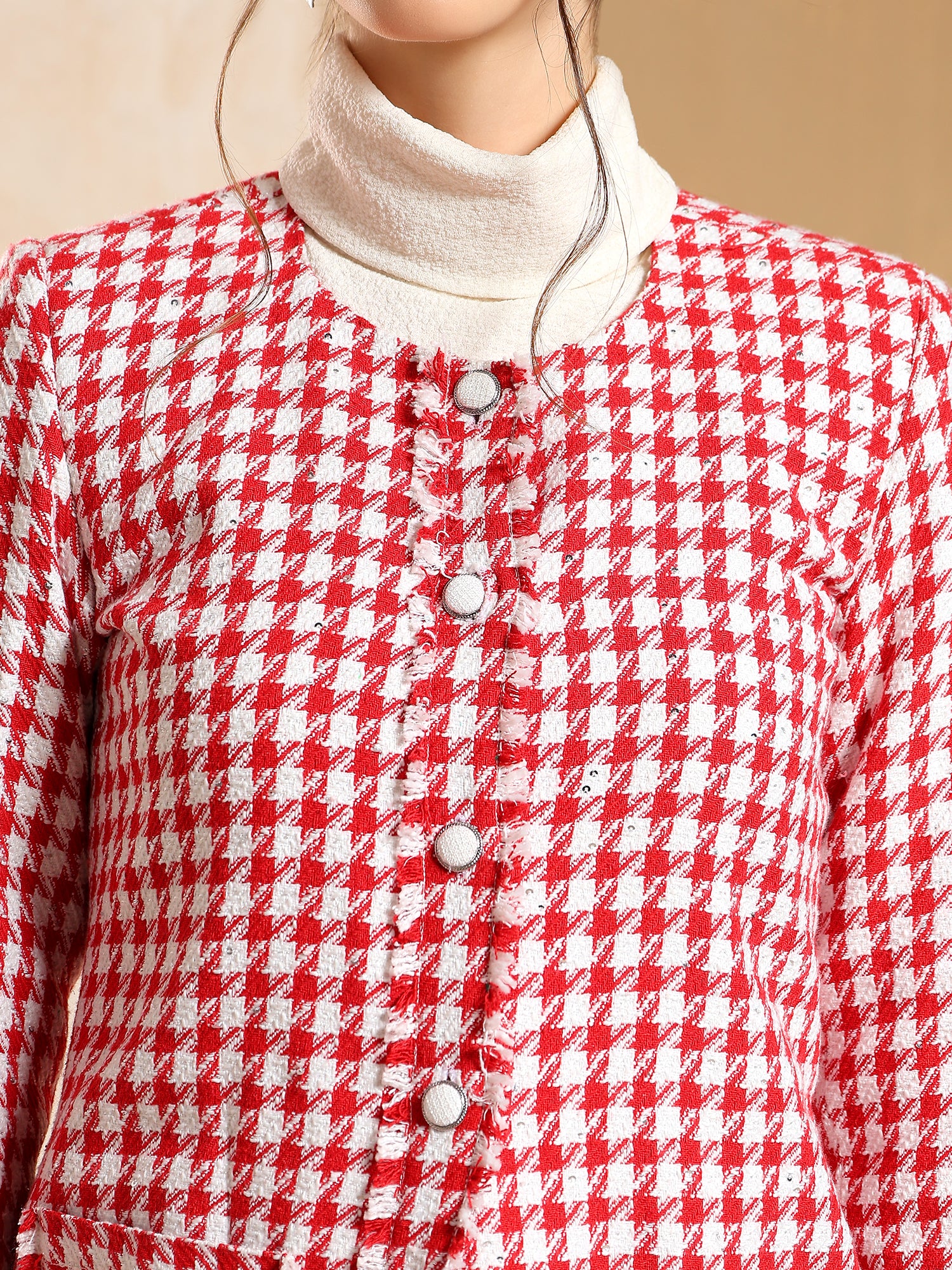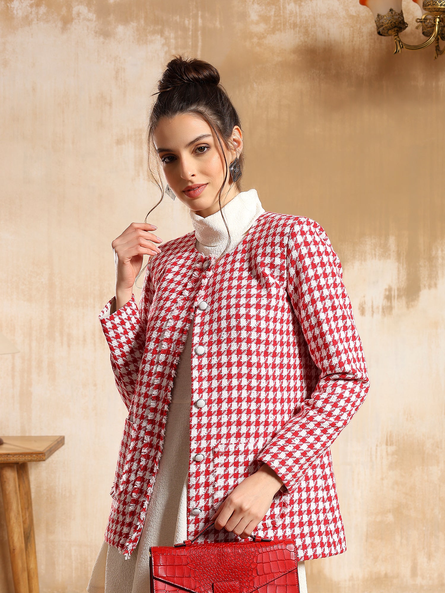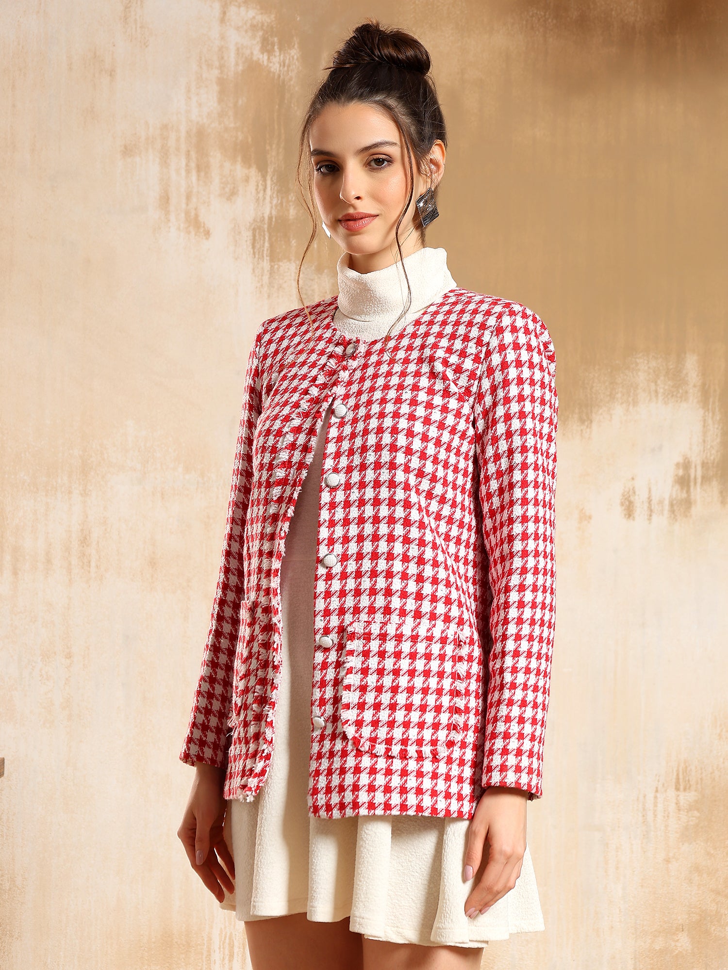 A statement in structure and style, this tailored houndstooth jacket stands out with its green-and-red pattern and refined button detailing. Designed for the woman who owns her presence, the jacket blends classic pattern play with modern power dressing.