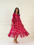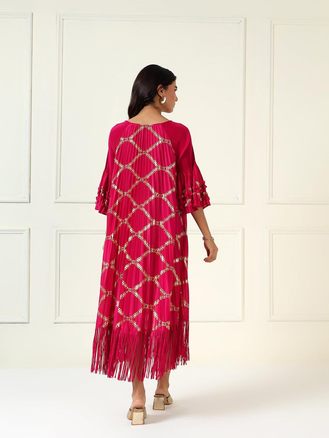 Zaria is a celebration of modern elegance and playful charm. This lilac pleated dress features delicate gold foil motifs arranged in geometric grace, while layered ruffle sleeves and fringed hem add a touch of movement and whimsy. Light, flowy, and effortlessly statement-making — it’s made for the woman who shines softly but surely.